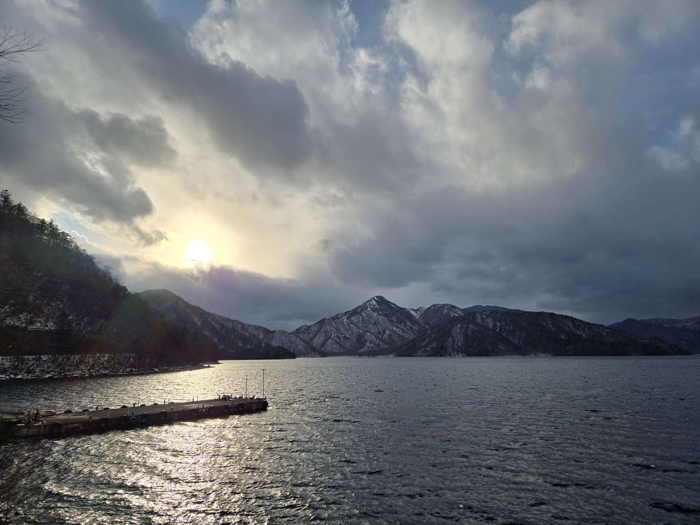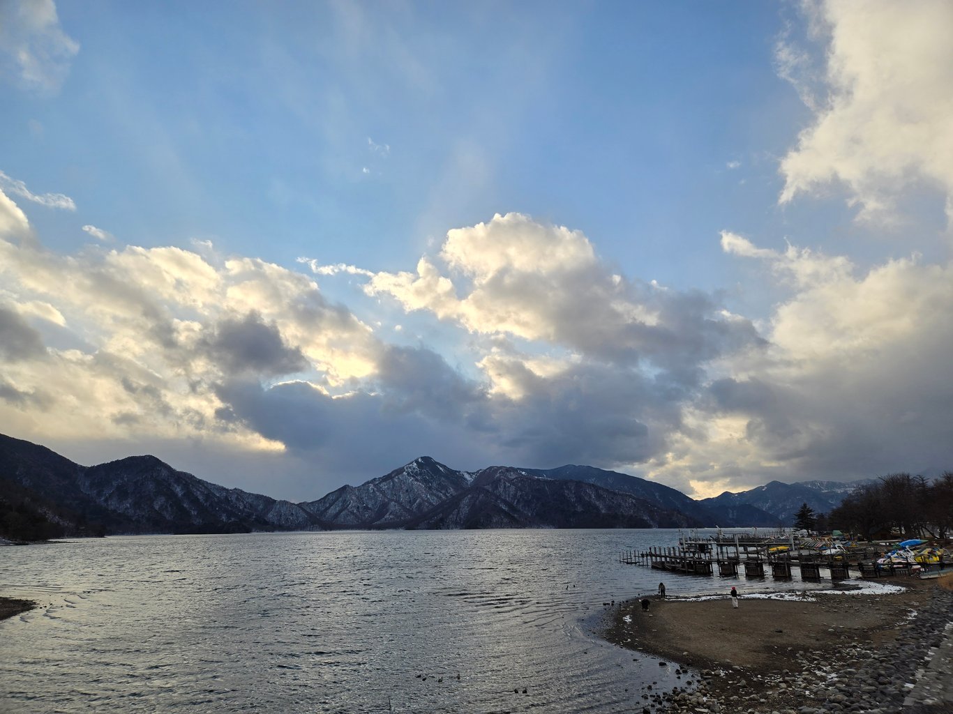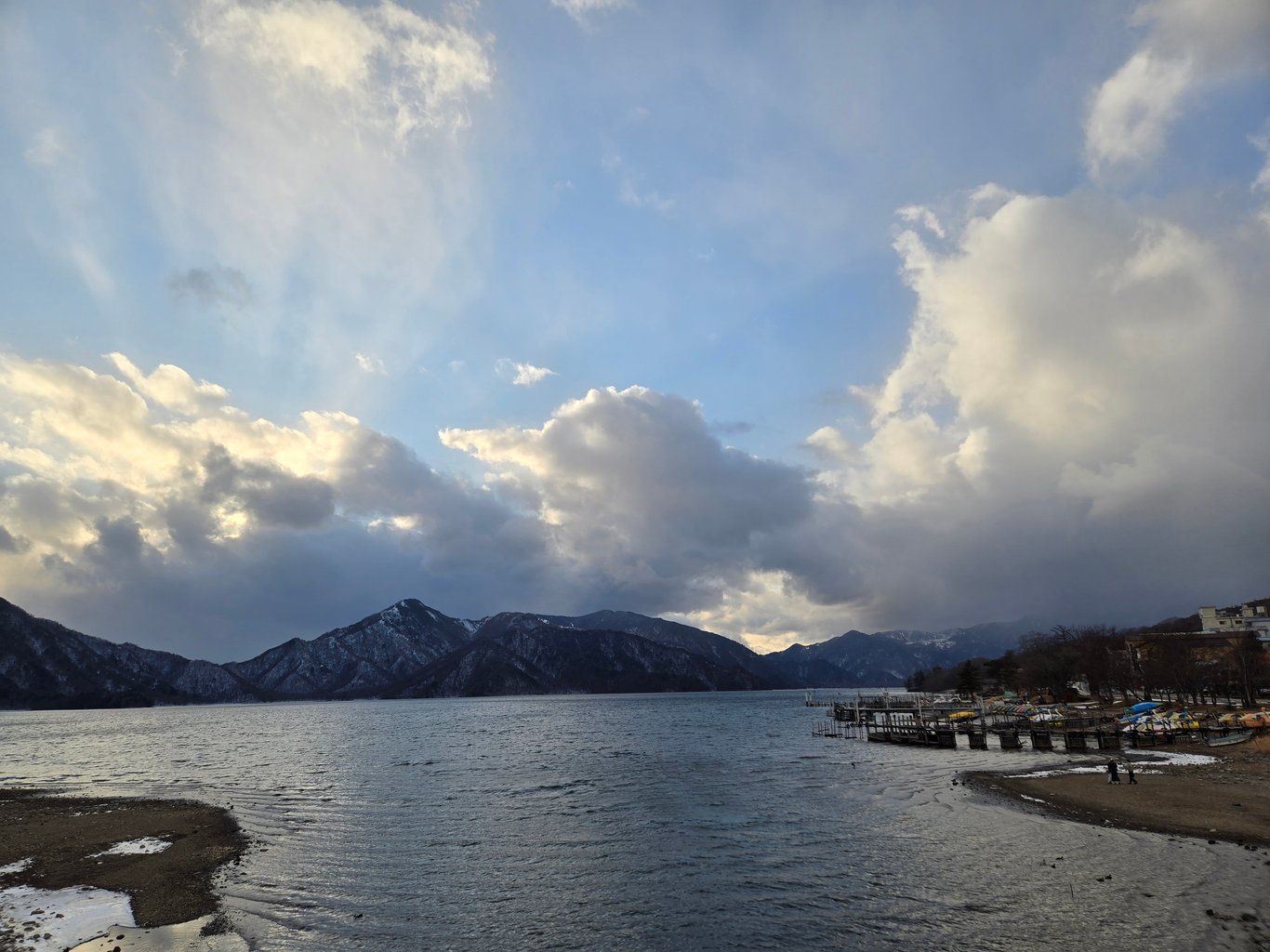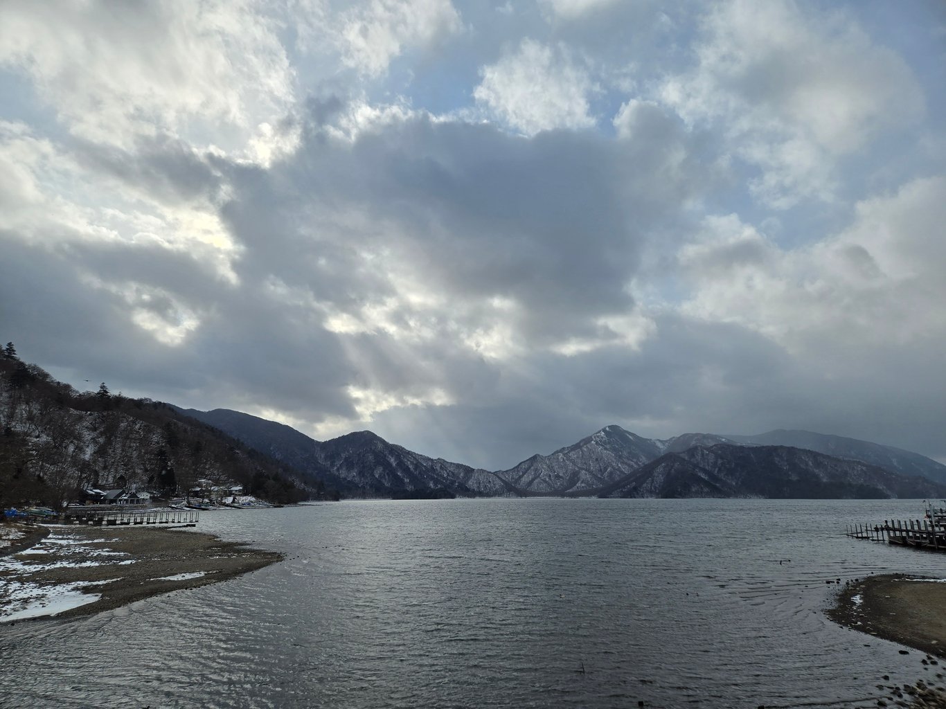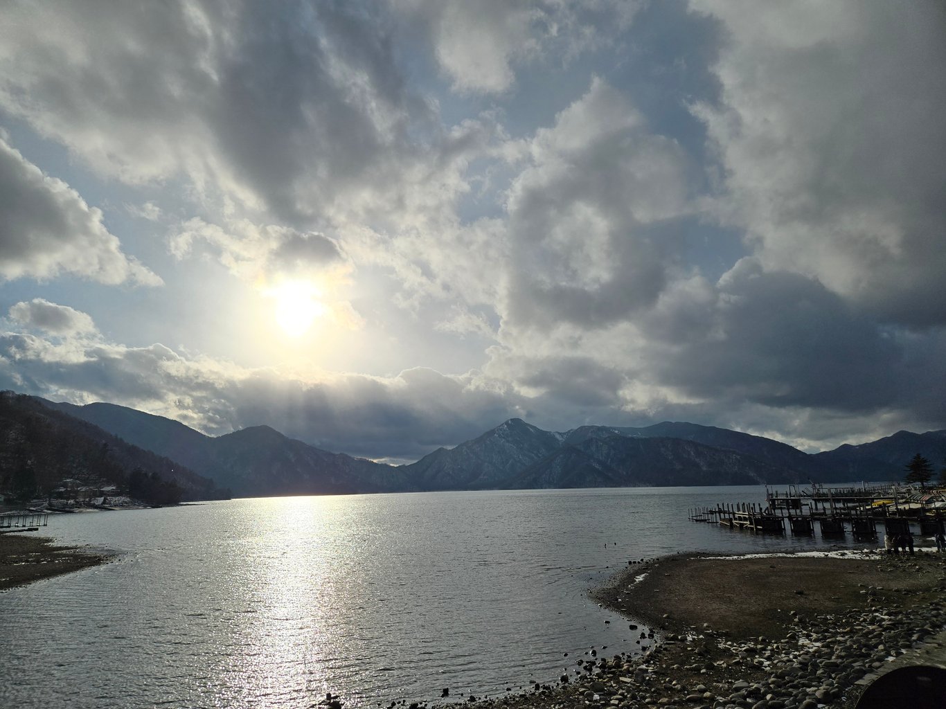 最终走回了中禅寺湖的东北角。此时天又放晴,于是看的是暮光中的湖景,上演大型丁达尔现场。我站在湖边,被暴风攻击了十几分钟,才最终受不了,离开湖边逃往车站。