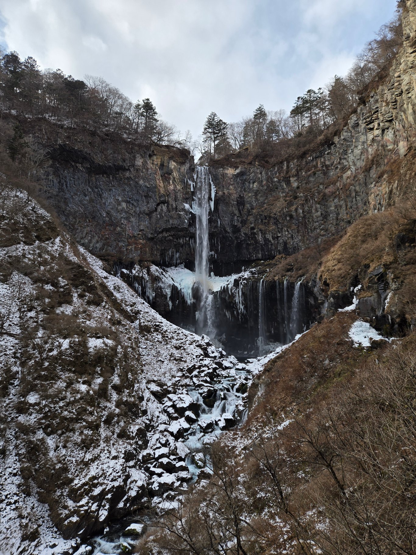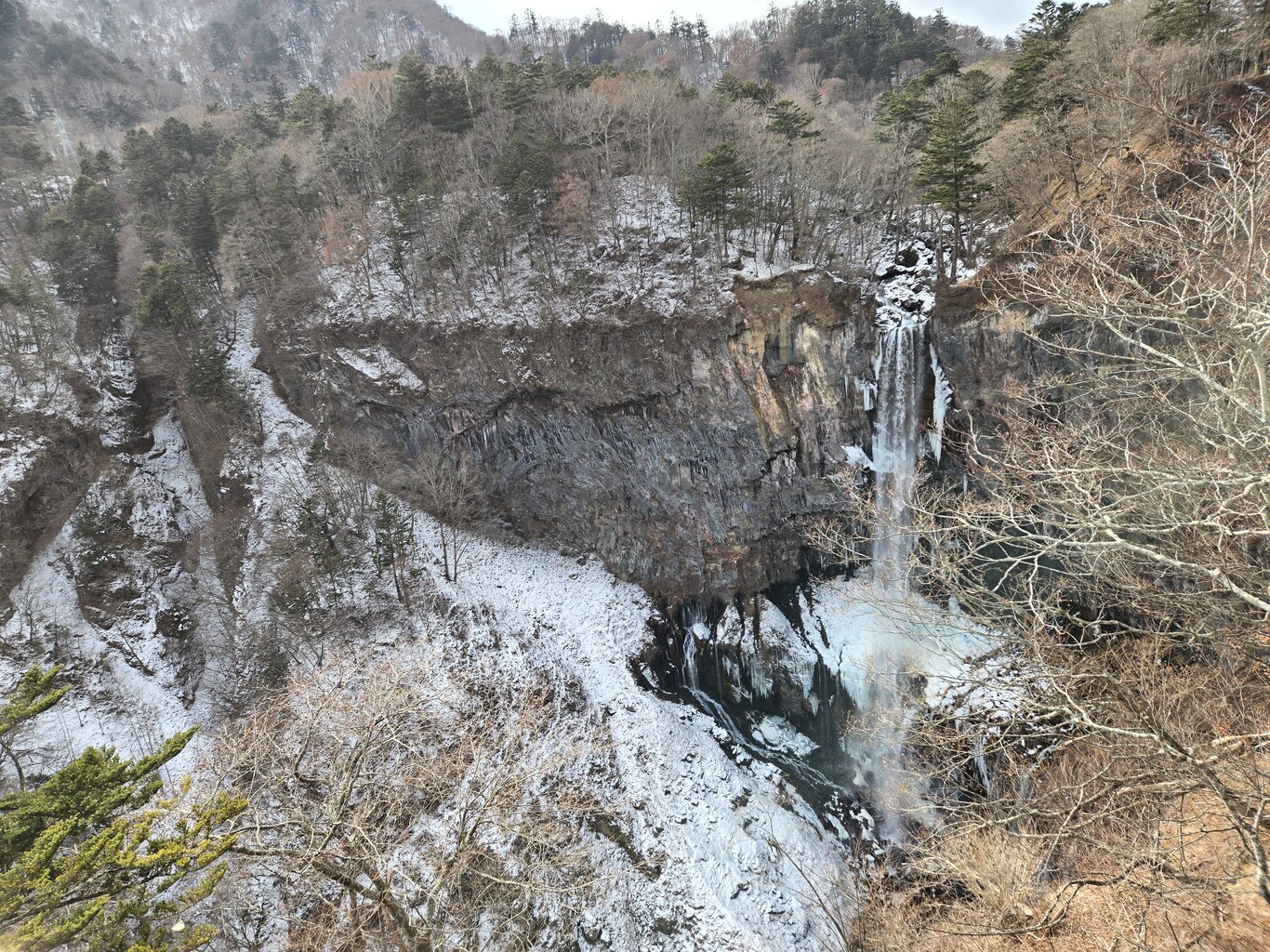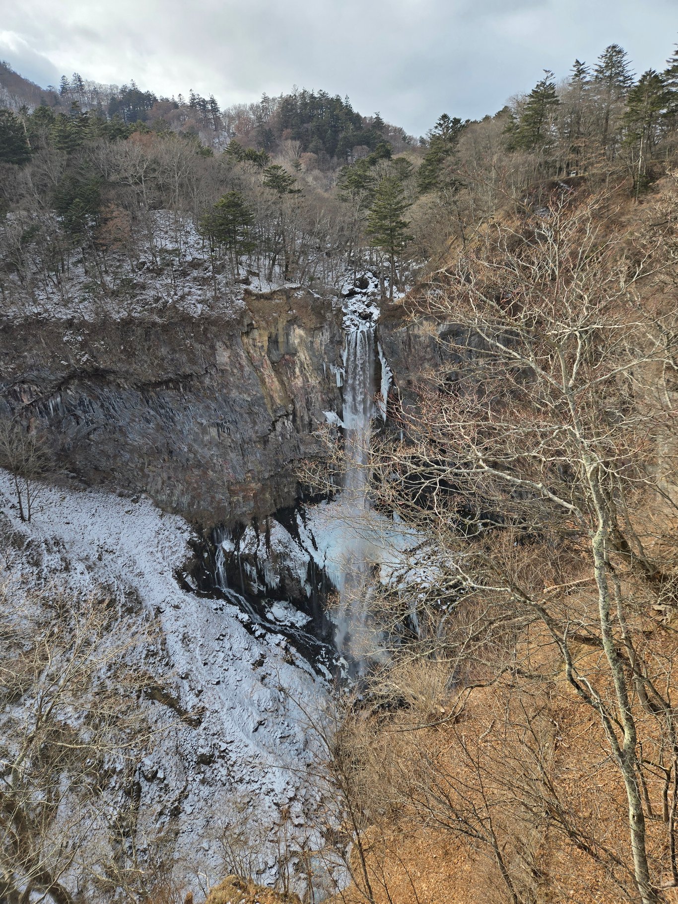 来到中禅寺湖,第一站自然是去华严瀑布,离公汽站只有几分钟路。我先到了免费观景台。本来我是没报什么希望的,华严瀑布是日本三大名瀑布之一,但众所周知的是,日本人特别热爱“三大”,制造了无数三大,且日本人特别喜欢把微型景点吹得震天响。但来到华严瀑布后我觉得我没有白来。虽然在我心目中,瀑布应该是非常宽,像一面帘子一样,但其实——我也没看过正经瀑布不是嘛?华严瀑布其实不小,至少高差很大,有97m,站在瀑布前,只看着白练击穿冰雪,落入白色的深渊,耳边只有“冰崖转石万壑雷”,感觉属实不错。