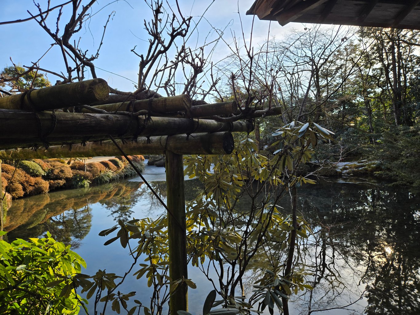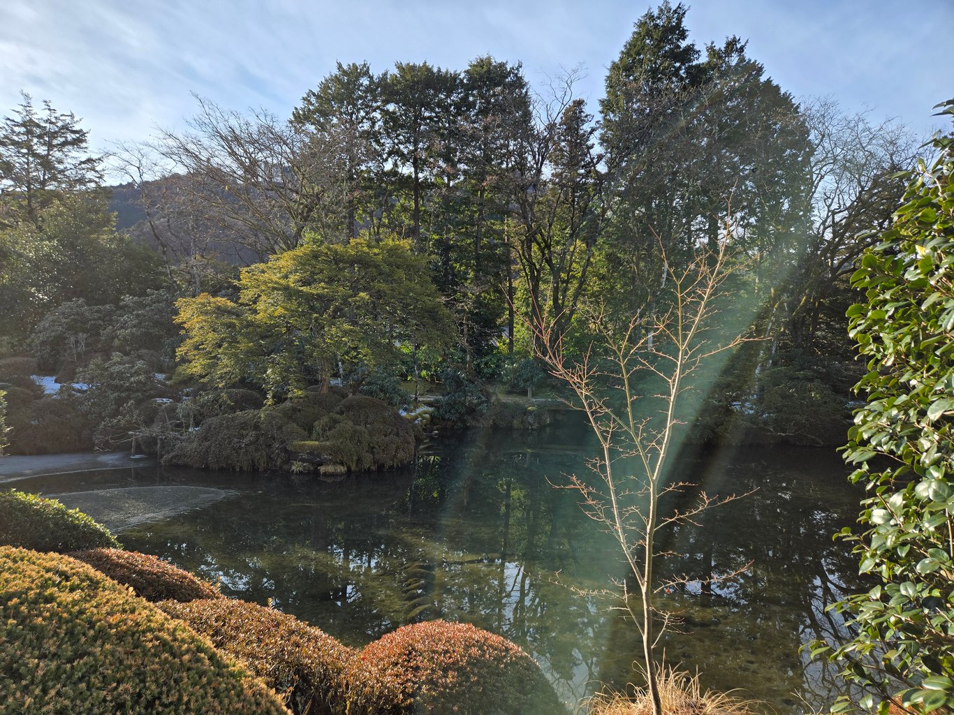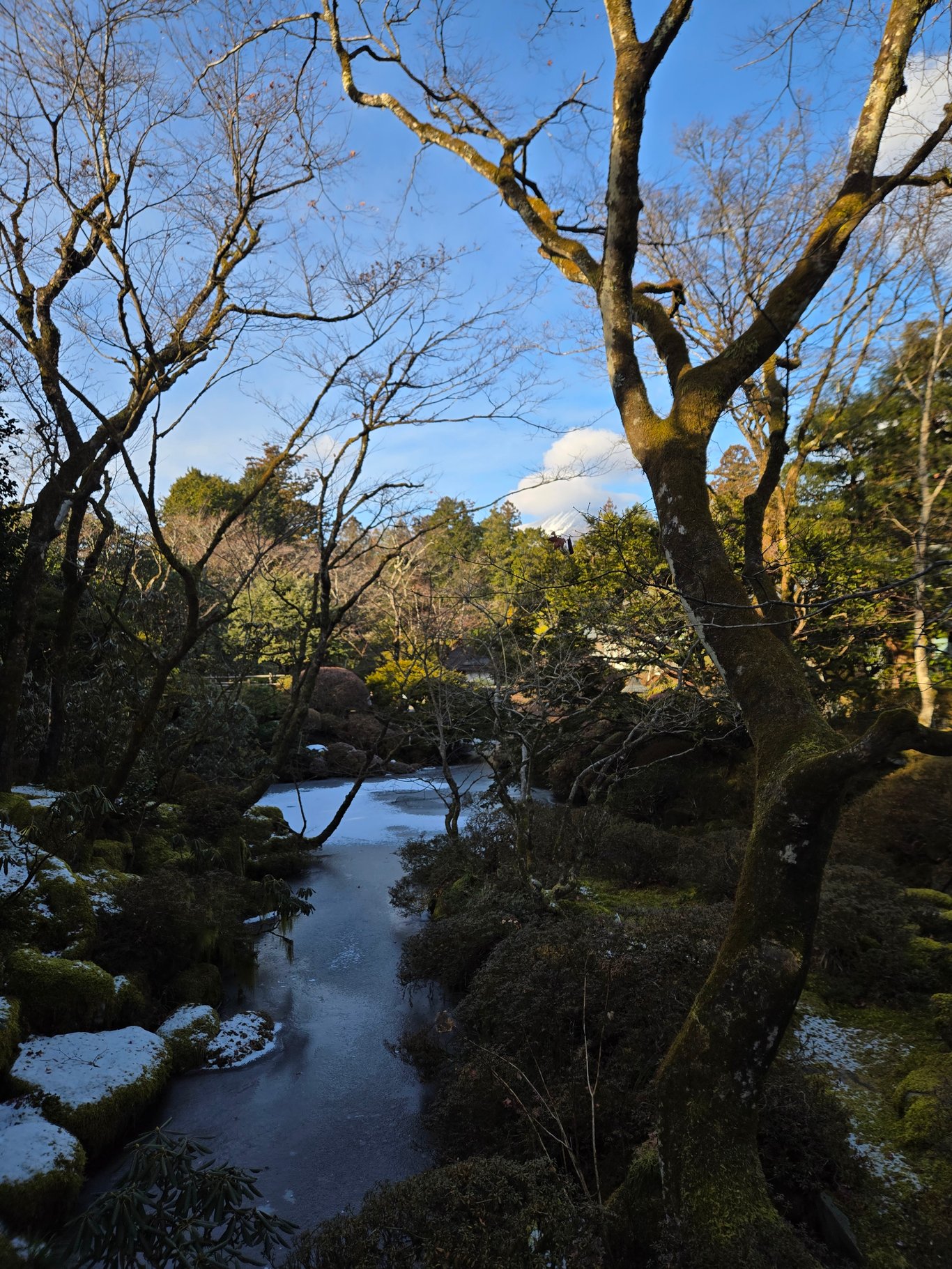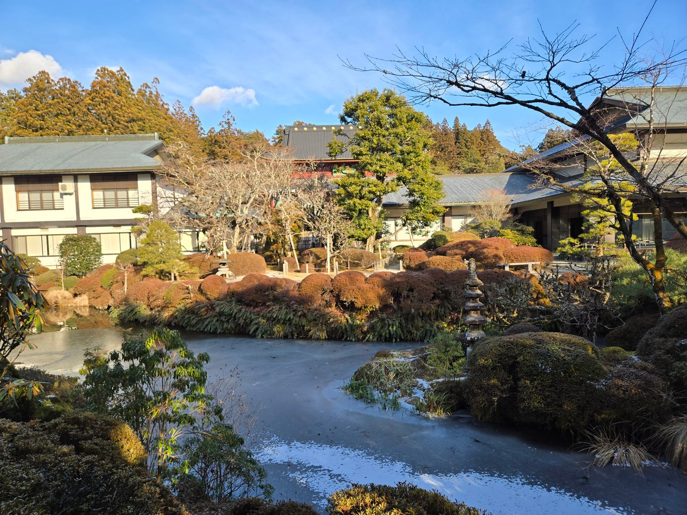 轮王寺对面有一个宝物馆,值得一看,里面有不少轮王寺里的文物,也不贵。宝物馆后院有一个日式小庭院,虽然没什么精致的东西,但氛围很好。特别是现在是冬天——冬天的景色是纯净的,冷得纯净,在结冰的池塘边还能看到远方积雪的山头。但我不知道是什么山,感觉不像男体山。