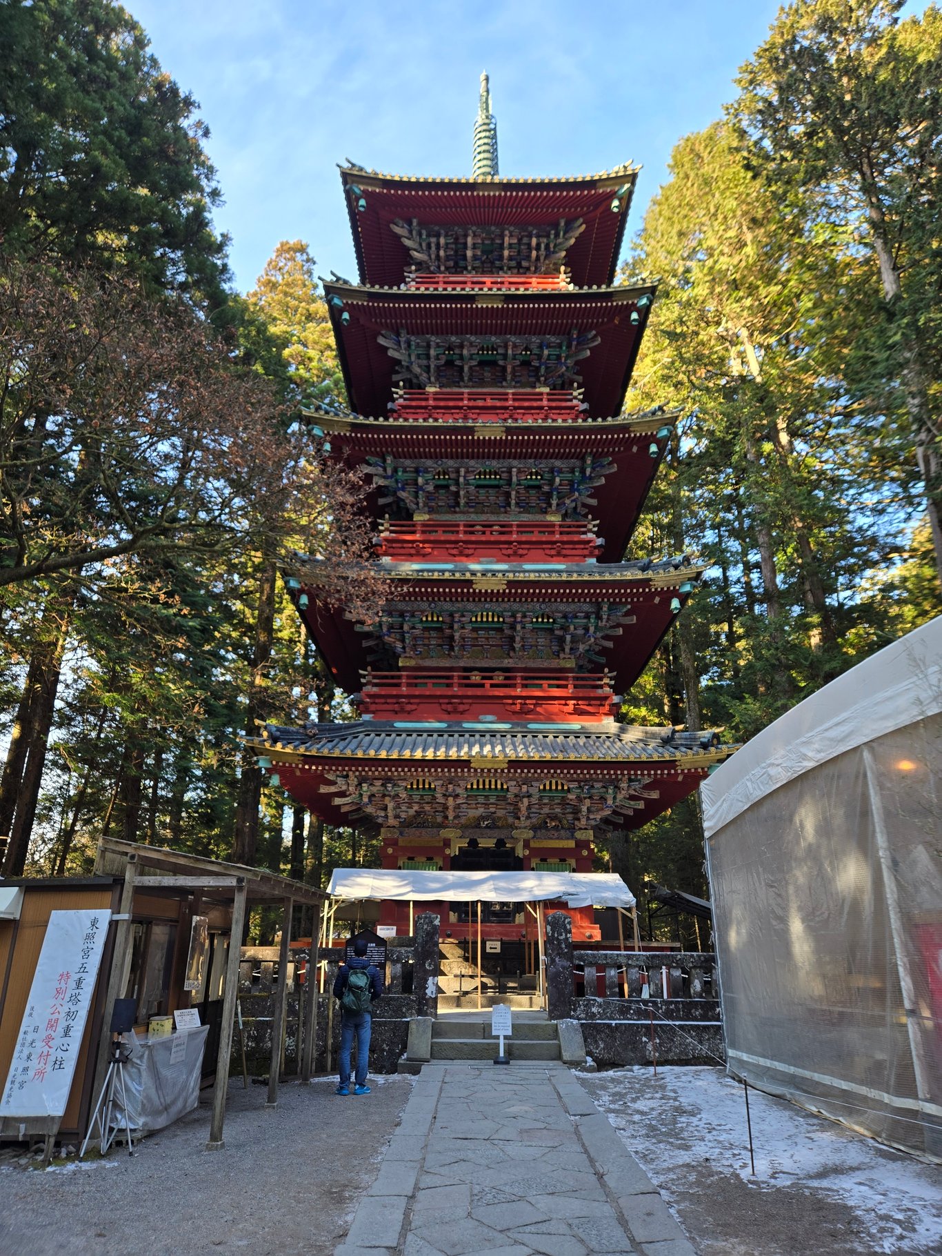 离开轮王寺,当然就是日光东照宫。过了第一道鸟居,巨木参天之下就是宽阔的庭院。旁边有一个五重塔,花300日元可以去看五重塔的细节和塔的内部。塔上的木雕非常精美,和日本现代寺院里糊弄洋鬼子的简约五重塔根本不是一个级别。塔内不许拍照,但我看到了,是几尊佛像,拱卫着一根中心大柱子。
