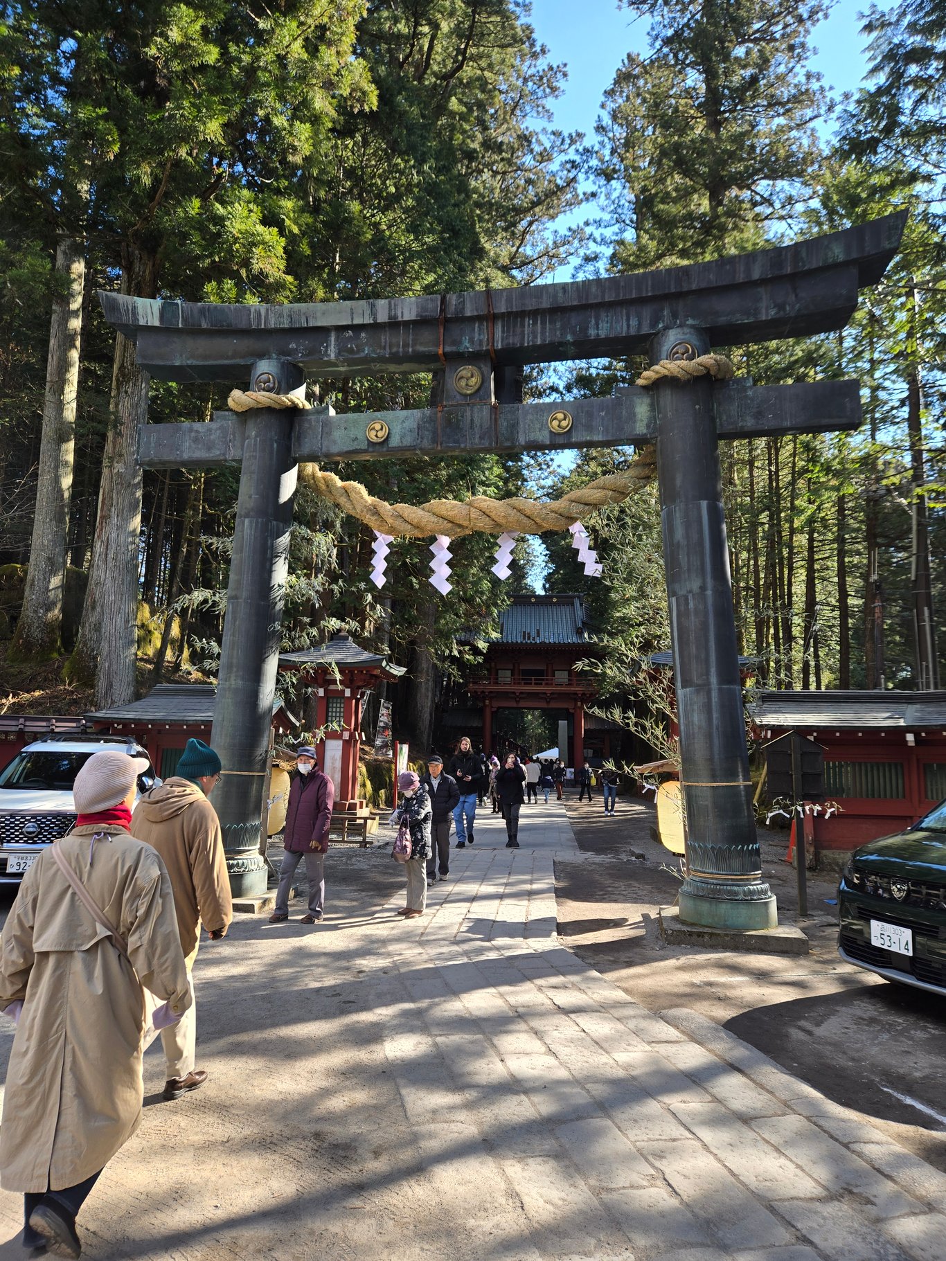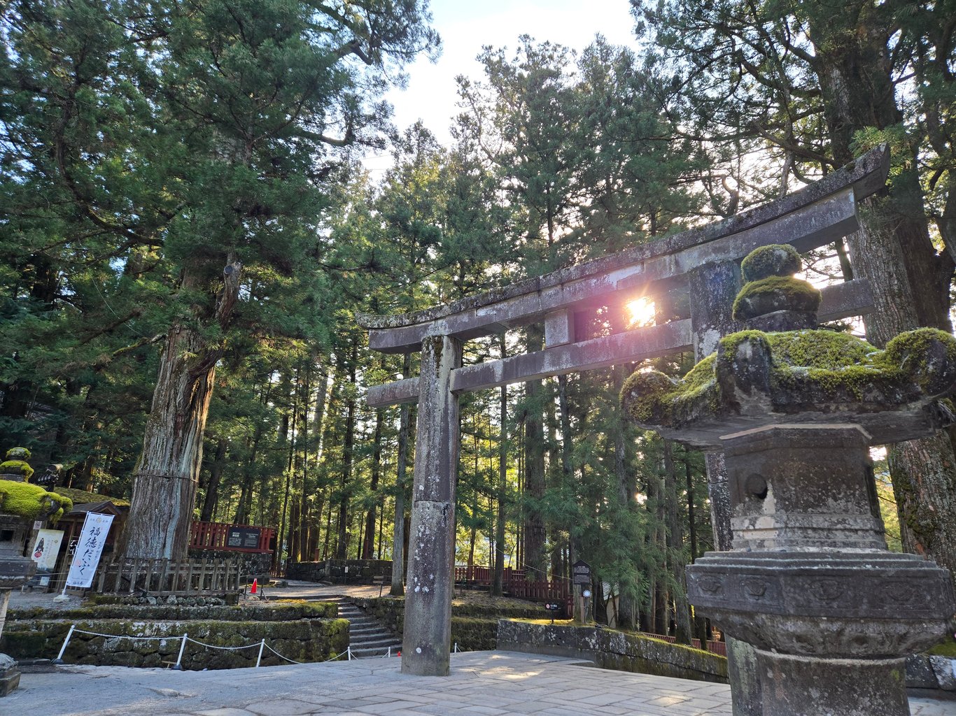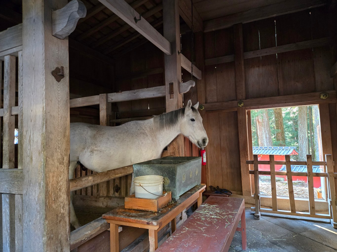 离开五重塔,我在售票处买了票,并仔细打量了第一进庭院。当我转头看向鸟居时,太阳正好从鸟居中间的孔射进来。真是巧啊,日光东照,我当时立刻想到。但其实没觉得幸运,倒不是主的好战士内心坚定,而是因为我仇视德川家康。第一金庭院里还展出了神社的小马,看起来很精致,像玩具一样。