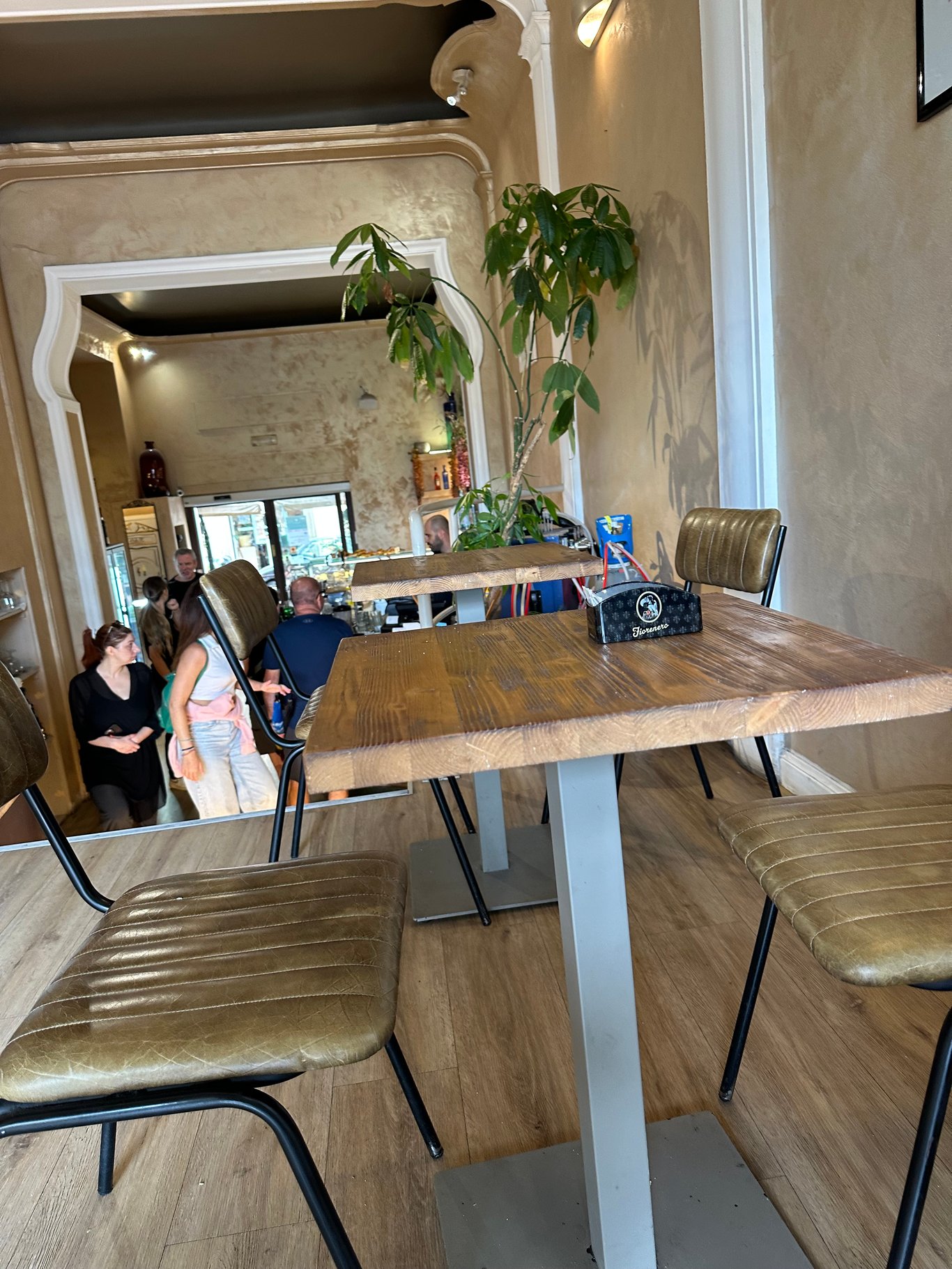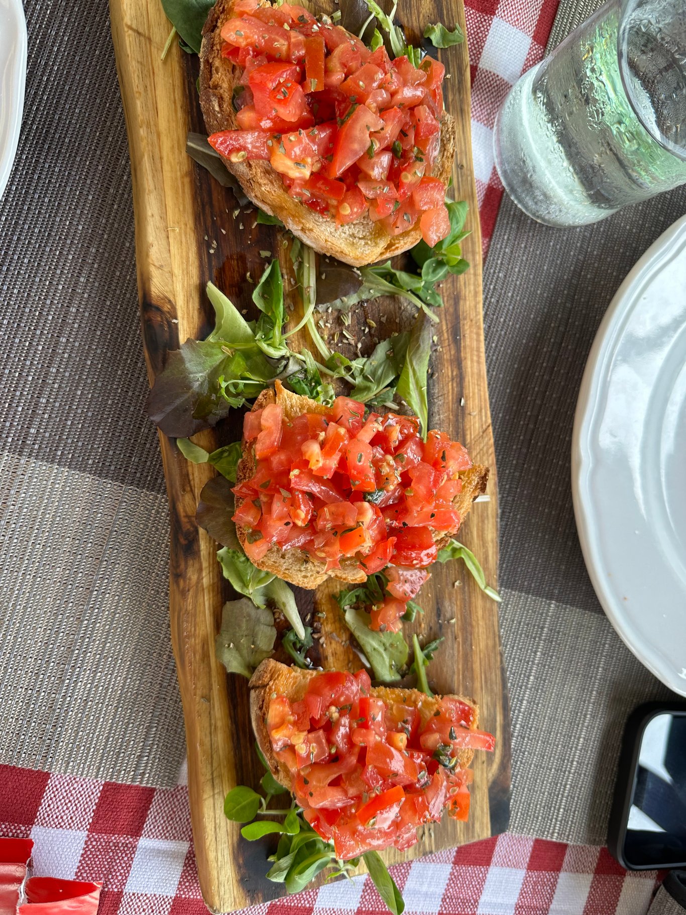 这家餐厅的规模跟dabraba 差不多。因为天气很不错,我们就选择坐在户外的座位。他们户外的位置不多,小小的一个帐篷搭建着,简单地放着几张小餐桌。我们是第一桌来就餐的客户。我们点了前菜,煎面包上放西红柿,很不错的开胃菜。