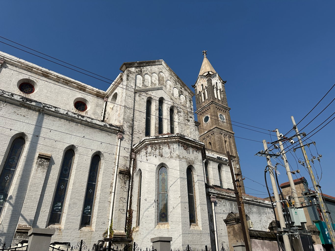 我来到一座白色老天主教堂,正好赶上周日上午的弥撒,这座理事厅教堂是1905年意大利外方传教会修建的,在教堂外墙有开封教会历史、教堂历史和几位中外主教的介绍,观摩弥撒之后出门,发现对面是回民中学,旁边有家非常推荐的孙记烧饼夹肉,我就在那解决了早餐。