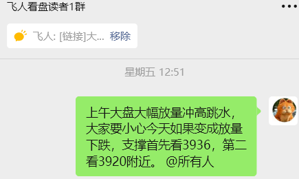 之后周五上午大盘大幅放量冲高跳水,我在群里提醒大家要小心今天如果变成放量下跌,支撑首先看3936,第二看3920附近。 @所有人