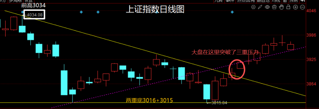 如果大盘走势要变强,必须要放量上涨突破3910附近这三重压力,重新站稳这三重支撑之上,才有望继续向4000点反弹。否则,这三重压力是很重的,缩量在2万亿以下是难以突破的。