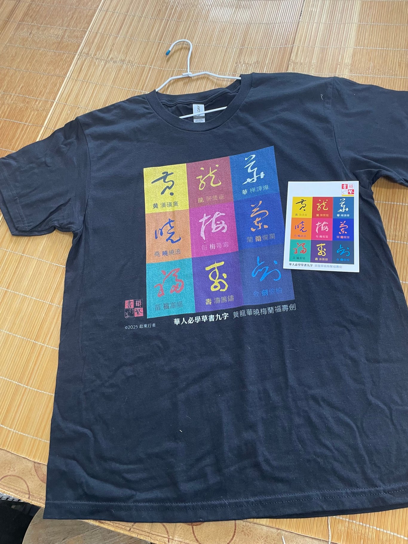 最後,請容我安插一段工商時間老王賣瓜,這是我自己設計的明信片和 T-Shirt,華人必學草書九字:黃龍華曉梅蘭福壽劍。上星期,我穿著自己設計的 T-Shirt 到錄音室錄自己譜寫的歌,跟大家分享!