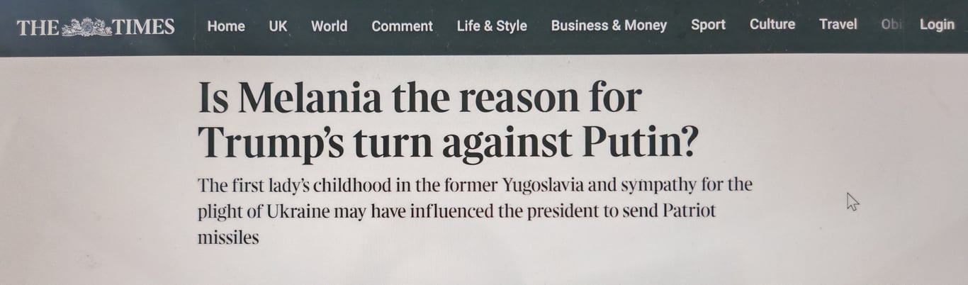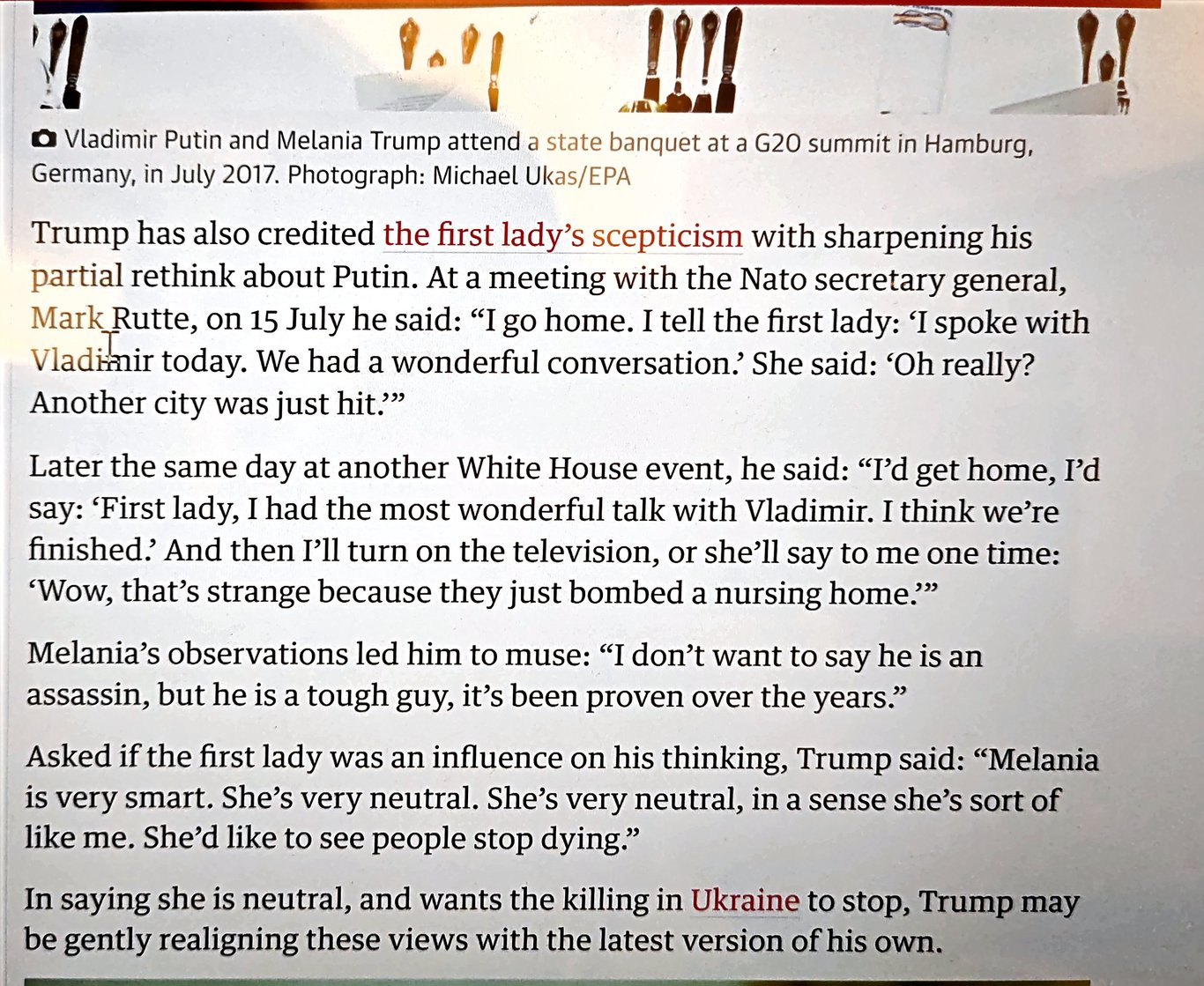 記者問第一夫人有否影響他有關烏克蘭的想法,特朗普回答:「Melania十分聰明,十分中立……她不想再有人死亡。」