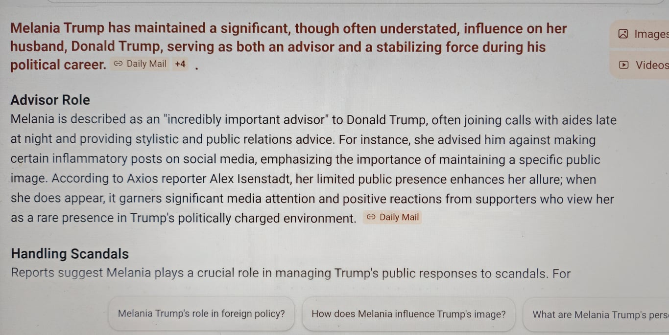多年來,Melania回答有關夫妻相處的答案都一樣:她沒想過改變特朗普,即是全然接納,特朗普怎不信任她,尤其涉及多宗性騷擾和性侵指控後?Kessler引述有參加特朗普會議的前白宮官員,形容Melania不離地,有政治觸覺,意見往往一語中的,特朗普聽她的意見,言之成理。(特朗普也信任她最寵的女兒Ivanka,但她在白宮成事不足,敗事有餘,最後都要離開,專心營商。)