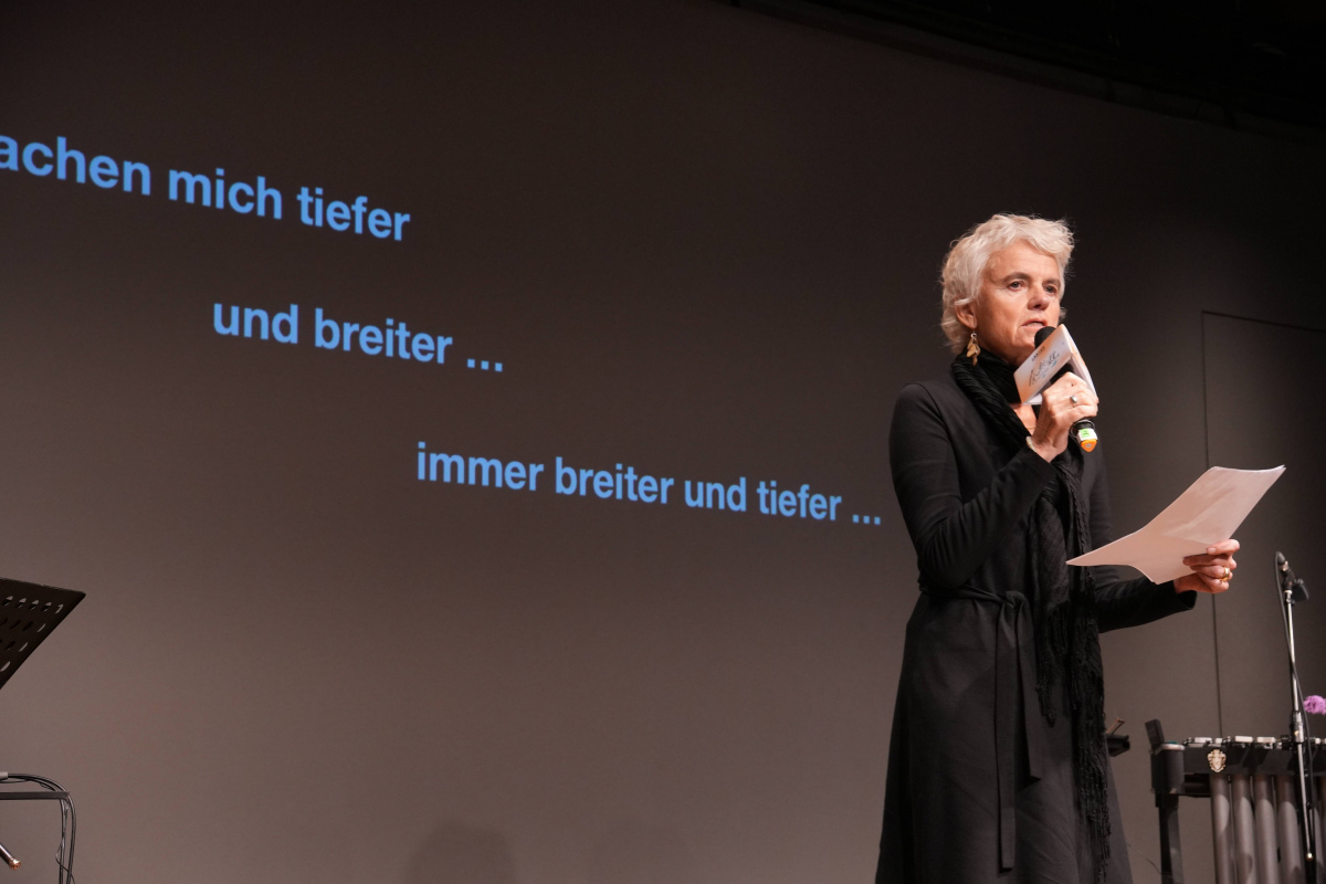 Alice Grünfelder用德語帶來〈Der Fluss spricht 話河流〉。吉他聲像是激流碰撞河岸岩石一樣地最先流瀉,鐵琴則是更深的平靜順流,薩克斯風發出嘰嘰聲響,像是器械的存在。接著進入詩的第二段,音樂變得充滿疑問,薩克斯風的問號最大聲,再來是吉他表現的錯愕,鐵琴則像是細碎低語。