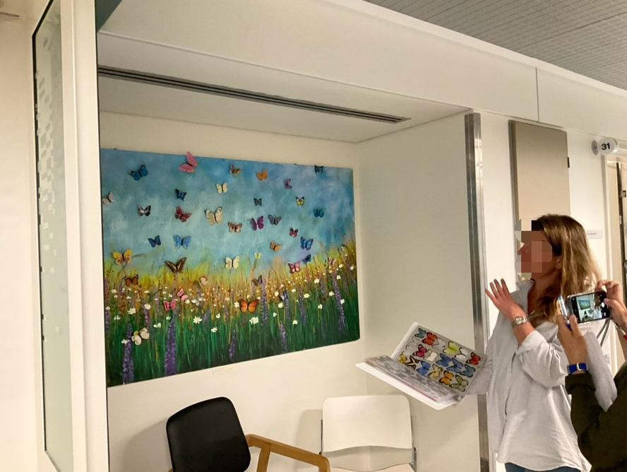 除了對流產家庭提供醫療的照護和支持外,社會性的支持也是關注的重點。例如,產房的走道上有一個櫃子,裡面裝滿許多布偶,全是由慈善志工編織和捐贈給醫院,讓流產家庭可以出院時帶回家做紀念。另外,Hvidovre Hospital在兩間產房的外面——休憩區的牆壁上也特別闢出一面「蝴蝶牆」。Louise跟我們解釋,每一隻顏色大小不同的蝴蝶都是流產家庭放上去的,是對寶寶的紀念,也是對寶寶的祝福。讓流產家庭離開醫院後,不會有什麼未了的遺憾。