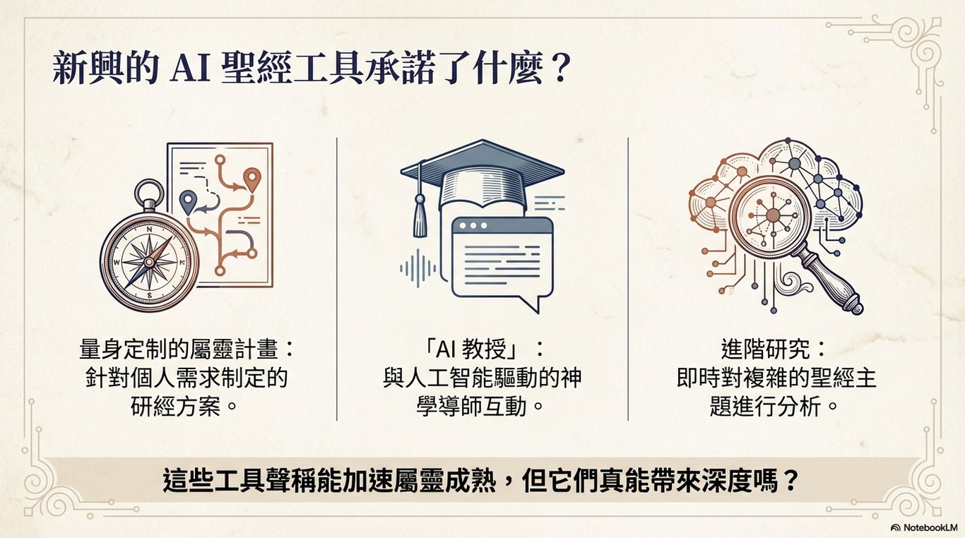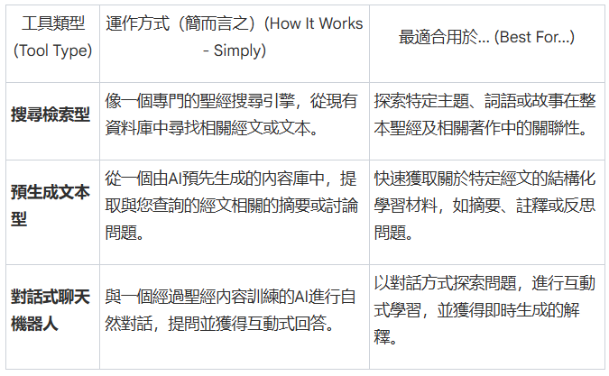我們一同探討了三種主要的聖經學習AI工具:用於深度連結的搜尋檢索型工具、提供現成材料的預生成文本型工具,以及實現互動學習的對話式聊天機器人。理解它們之間的差異,是有效利用這些新技術的第一步。希望這份指南能幫助您明智地選擇合適的工具,讓AI成為您個人靈命成長與聖經研讀旅程中的有益輔助。