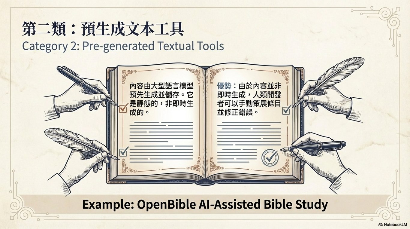 一個很好的例子是Openbible網站所提供的《AI輔助聖經學習》(AI-Assisted Bible Study)工具。對於希望快速獲取關於特定經文的結構化、經審核的學習材料(如查經班的討論題目或個人靈修的摘要)的學習者來說,這種類型的工具非常實用。