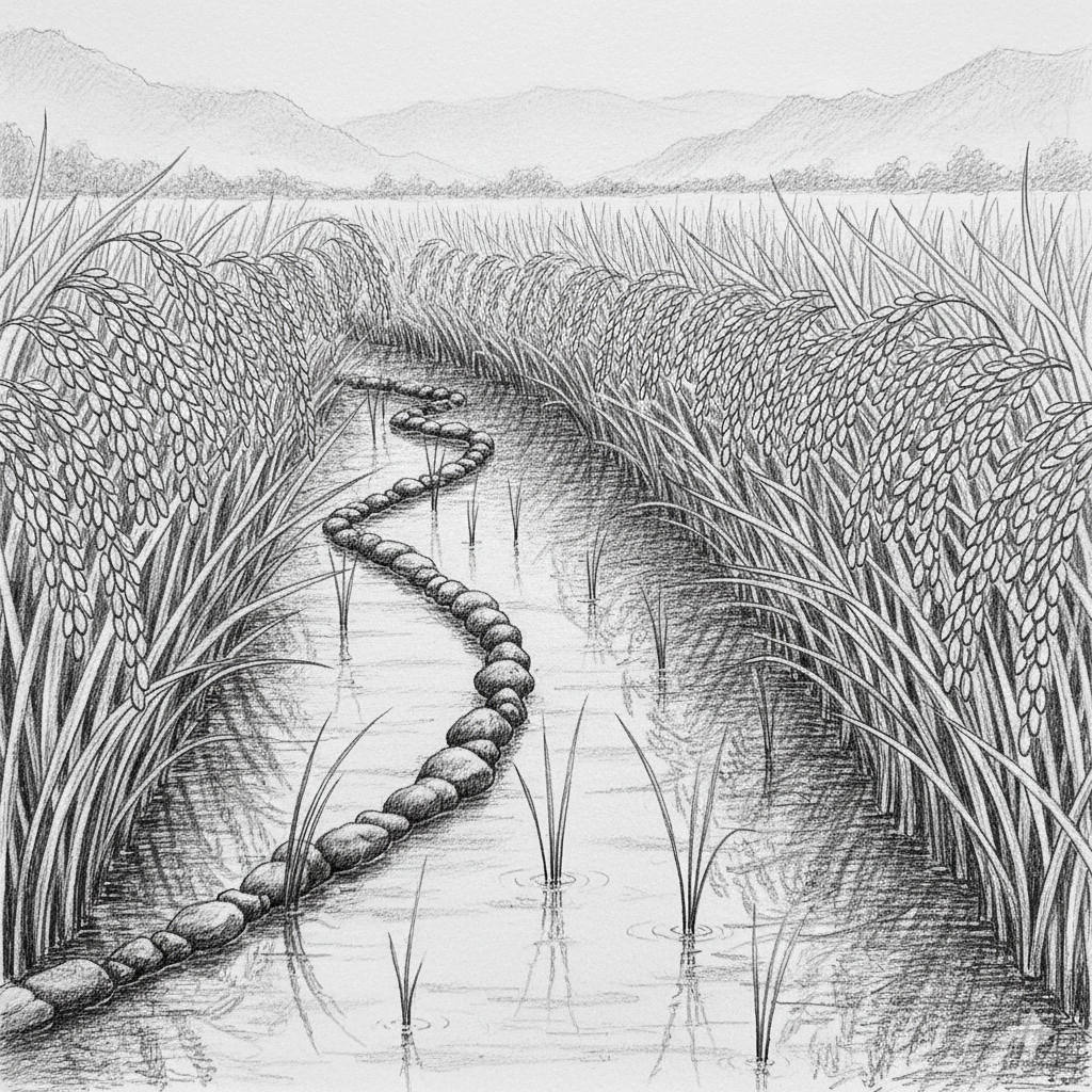 • 盛夏的巡田:烈日如炙,雜草瘋長。夫妻倆跪在滾燙的水田中,指尖在泥中搜尋卑微的稗草。他們時刻巡視著水路,守護著那涓涓細流,彷彿守護著家人的命脈。