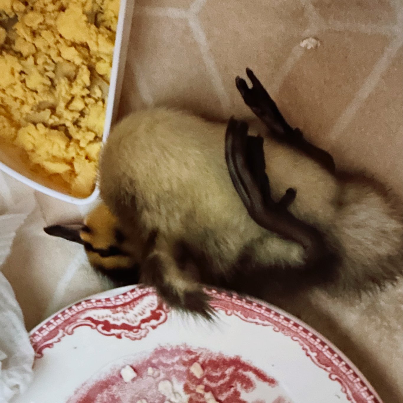 大女儿说发现Molly的时候,她没有在窝里,可能是晚上跳了出来玩,因为黑看不见,一只脚卡在塑料箱沿和纸箱壁的缝隙里。