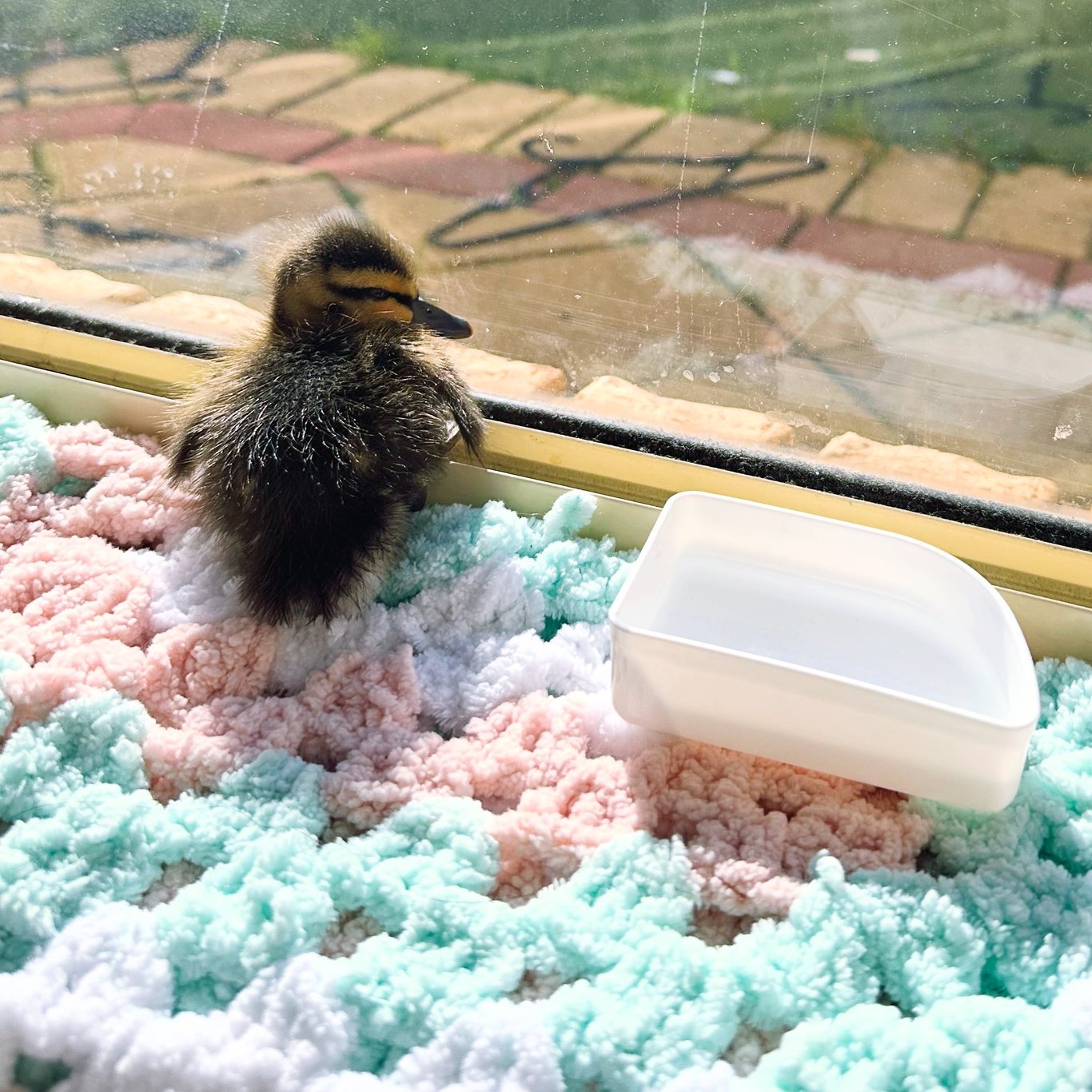 AI尽职地给了一堆答案,喂淡蜂蜜水,喂碎蛋黄。于是我们又是一通忙碌,我找了个不用的小塑料箱,里面垫上旧的绒布枕套。二女儿冲进我的房间,把我平时做钩织玩具用的填充棉拿来给垫上,可惜填充棉太碎,小鸭子站不稳,连连摔倒,她又只好把那些碎棉拿走,按我说的去换了个旧毛巾。