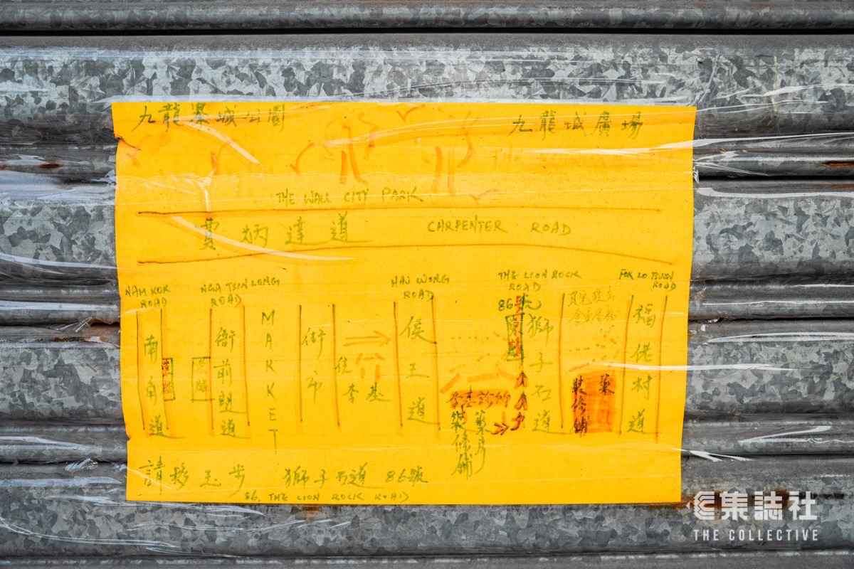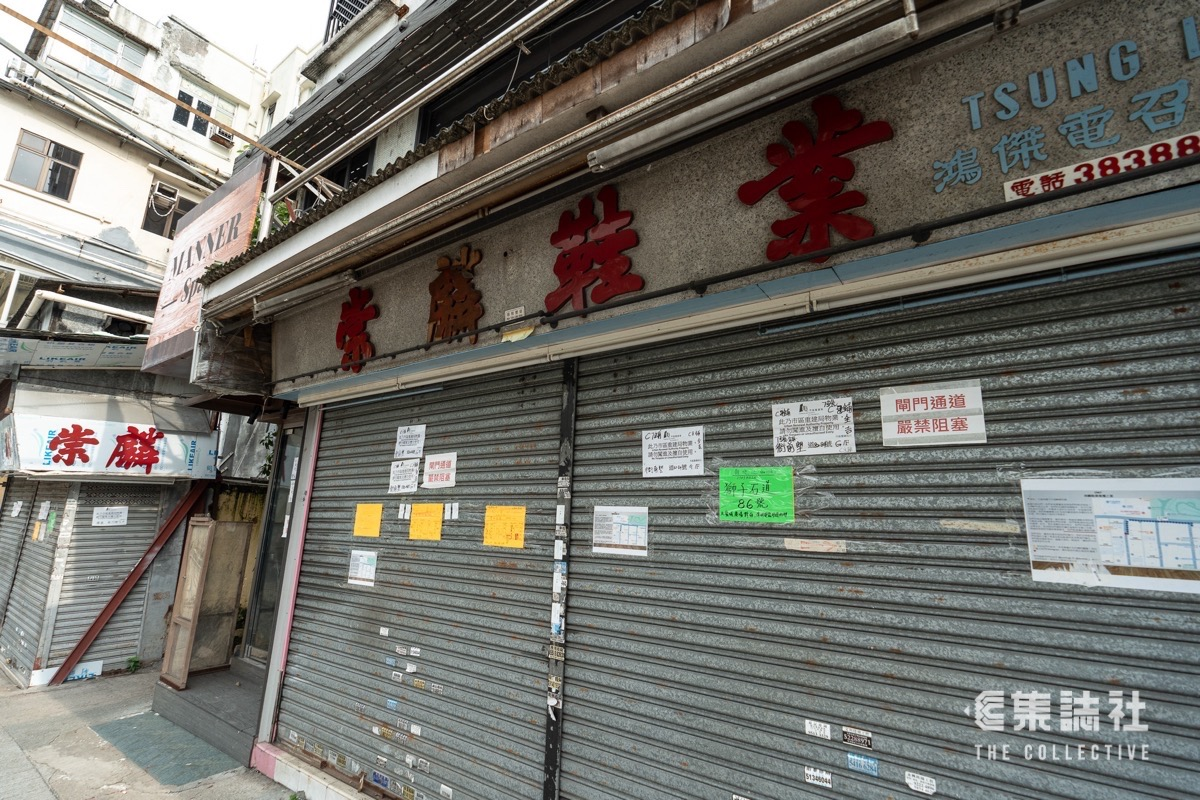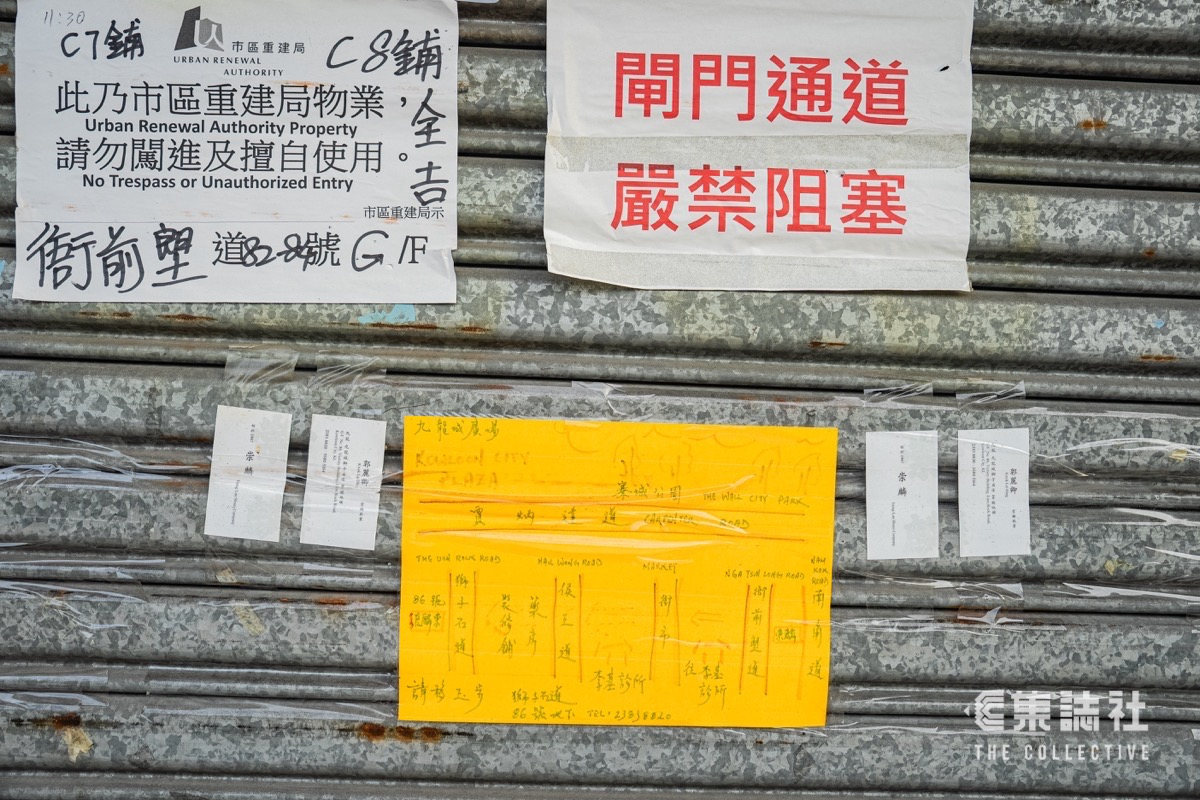 「此乃市區重建局物業,請勿闖進及擅自使用。」在九龍城衙前塱道 82至 84 號「崇麟鞋業」鐵閘外,貼上市建局告示。告示旁邊,還貼上幾張手繪和電子地圖,寫有「新地址」、「請移玉步獅子石道 86 號地下」。