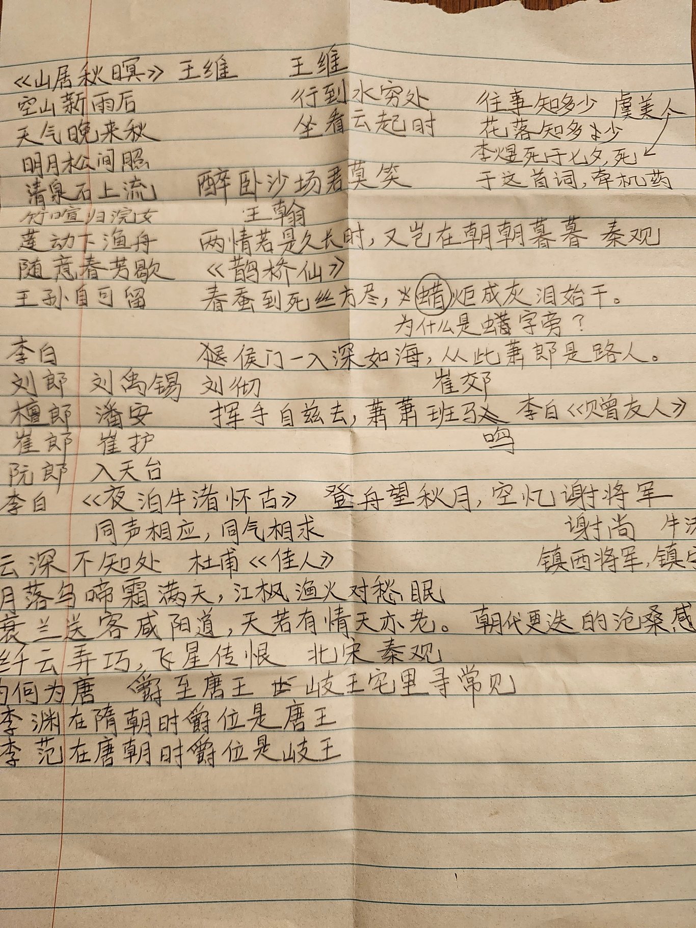 挥手自兹去,萧萧班马鸣。衰兰送客咸阳道,天若有情天亦老。为什么送客的时候用“衰兰”?唐朝为什么叫唐朝?唐朝的首位皇帝李渊在隋朝时的爵位是唐王,他称帝后延用自己爵位的名称来命名他开创的时代。岐王宅里寻常见,崔九堂前几度闻。这岐王又是谁?他是李范,李范的爵位是岐王,原名是李隆范,为避哥哥李隆基的讳,他被称作李范。那么在一个王爷的“宅里寻常见”的这又是谁?这些是我上周读诗笔记的一部分。诗中的人和故事是我想要了解的,读诗的节奏是让我欢喜的。每一次日子中遇到瓶颈的时候,或者有几分钟空闲的时间,我会拿出纸和笔,慢慢地写下几句诗,让自己安静,让自己高兴。