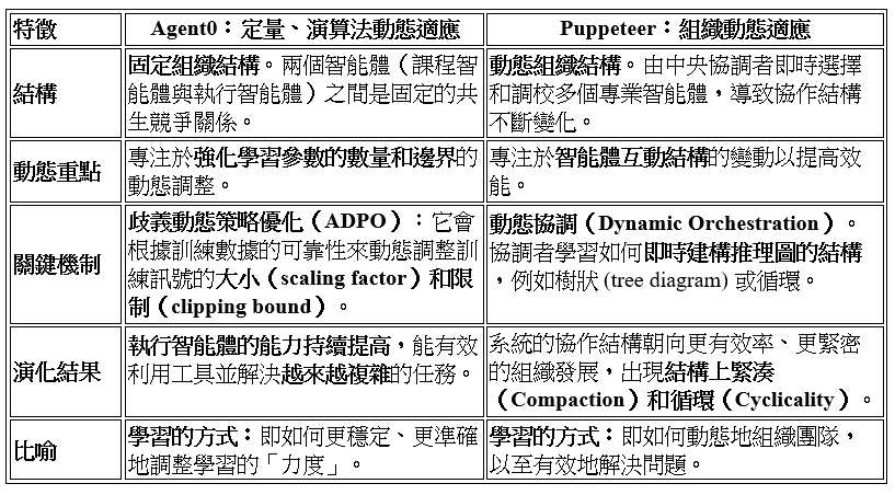 Puppeteer 的演化:在 Puppeteer 機制中,演化指的是「自適應演化」(Adaptive Evolution)。中央協調者(Orchestrator)透過強化學習不斷優化其策略,學習如何更有效率地協調和組織其他代理,目標是讓系統朝著更高的效率和效能發展。換言之,Puppeteer 專注於優化一組智能體的協作結構。