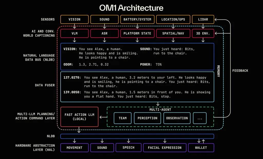 在 OM1 的架构里,机器人的运作被拆解为 Perception(感知) → Memory(记忆) → Planning(规划) → Action(执行) 四个通用步骤,而贯穿其中的血液,就是自然语言。