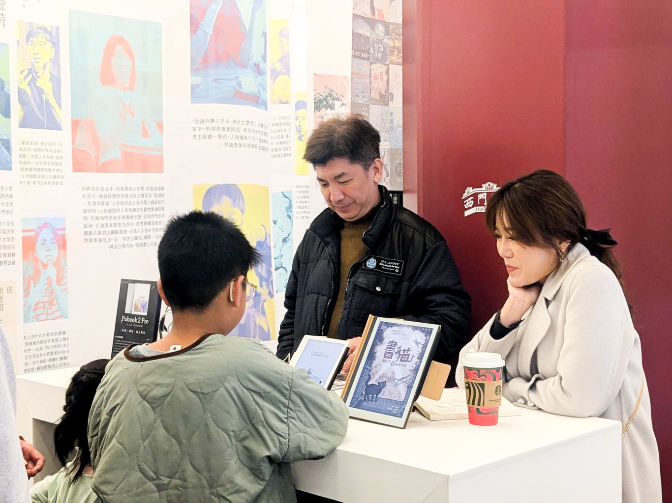 今年Openbook好書獎的獎座由木雕藝術家張意設計製作,他以國產的人工林木材、各種天然生漆以及銅粉製作。檯面上展示了張意的設計理念與製作歷程的各式迷你書雕像,可以近距離看到木質獎座的天然紋理與上漆後的內斂光澤。獎座旁還展示了犬吉工作室精心製作的手工書,歷年的手工書版型、樣態皆不同,各具巧思,是十分精緻有趣的動態展品。展場中也由Pubu提供電子書閱讀器,讓觀眾可以體驗不同閱讀形式的年度好書。