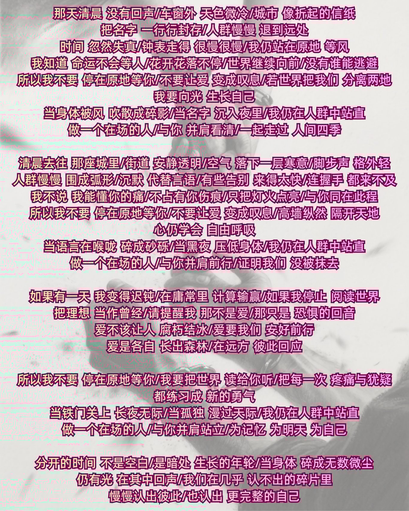 我不要“为爱的歌颂”成为谁堕落止步的借口。因此我承诺给你的爱,是在分离的时候,借着一切记忆,立起自己对健康、意义、勇气、善良与智慧更大的信仰。在我们的身体变成许多碎裂的碎片之后,我们要在几乎无法辨认的碎片中重新寻找对方,更是寻找到自己。