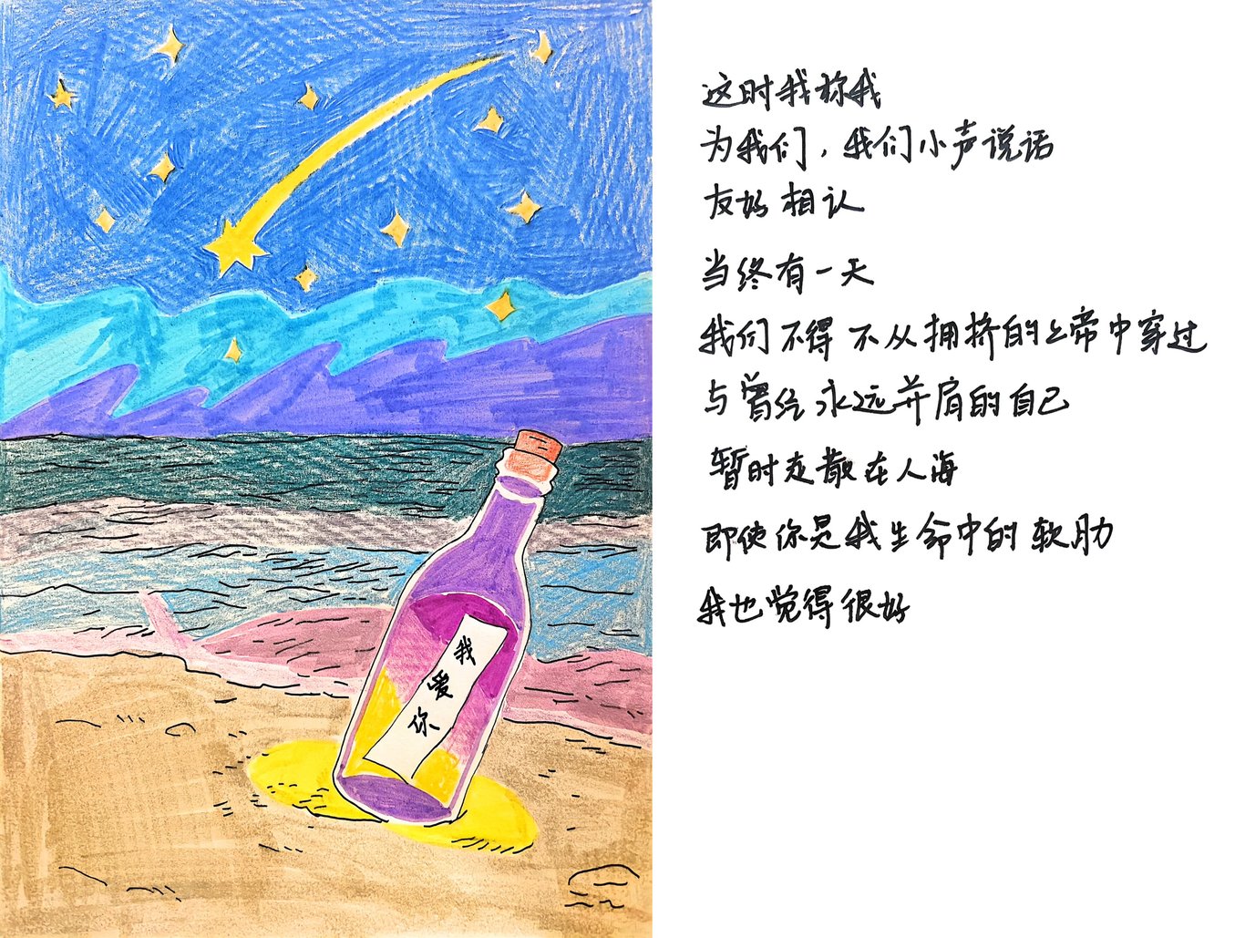 信里他说,让我替他抬头看看天上的星辰。于是我在1月30日回信时,特意画了一张手绘的流星、海边和许愿瓶,把我觉得最美的星空呈现给他。也许他此时还没有收到这封信,也不知道这封信能否顺利到达他手中。