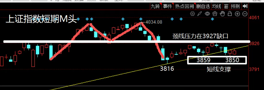 大盘近期两次反弹到缺口附近受阻回落,都符合我们文章分析的3927缺口附近就是大盘短期M头颈线位的压力,反弹到这附近减仓的策略。而两次回落低点3859和3850则构成了一个短期小支撑,大盘目前就在这期间震荡,如图: