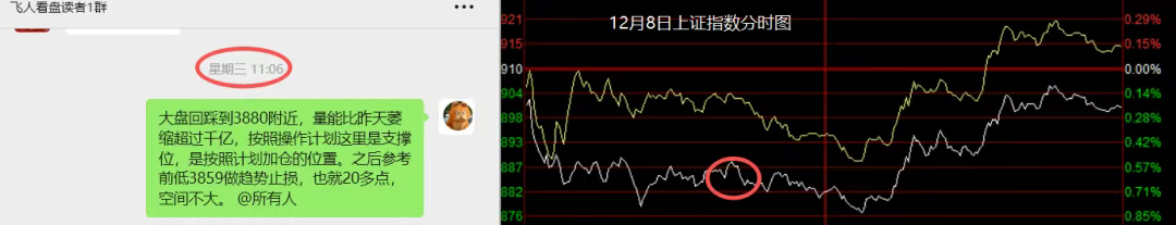 特地提示大家不要去3930附近追高,等待回踩机会加仓。之后大盘12月8日早盘果然回踩了3880附近,当时我中午提示可以加仓,止损空间很小。结果下午就反弹回到了3900点以上