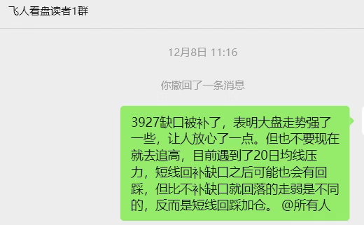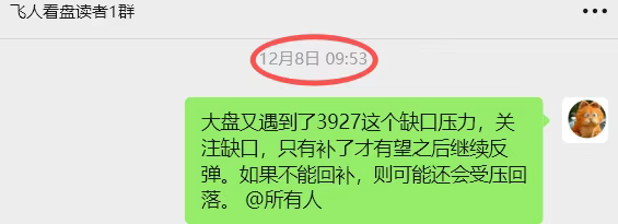 在大盘反弹二次接近回补缺口的时候,在读者群提醒大家关注缺口是否回补:大盘又遇到了3927这个缺口压力,关注缺口,只有补了才有望之后继续反弹。如果不能回补,则可能还会受压回落。 @所有人