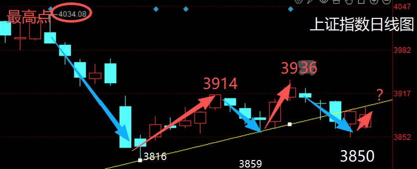 那么在大盘整体走势上,大家就可以用这两个位置做参考。如果大盘之后放量能突破3930并站稳,则短期双头压力风险化解,大盘震荡偏强。如果无法放量过上方压力,反而又一次跌破3850,则大盘走弱,就会再度考验3816-3800附近的支撑了。