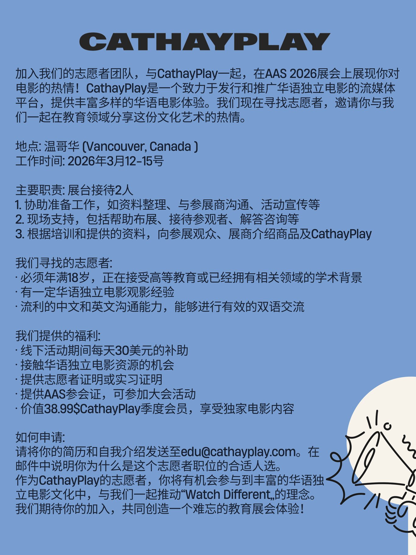 Join our volunteer team and showcase your passion for film at the 2026 AAS-Vancouver, Canada , in collaboration with CathayPlay! CathayPlay is a streaming platform dedicated to distributing and promoting Chinese independent films, connecting them with a global audience. We're currently seeking enthusiastic volunteers to help us share this artistic and cultural passion in the field of education.