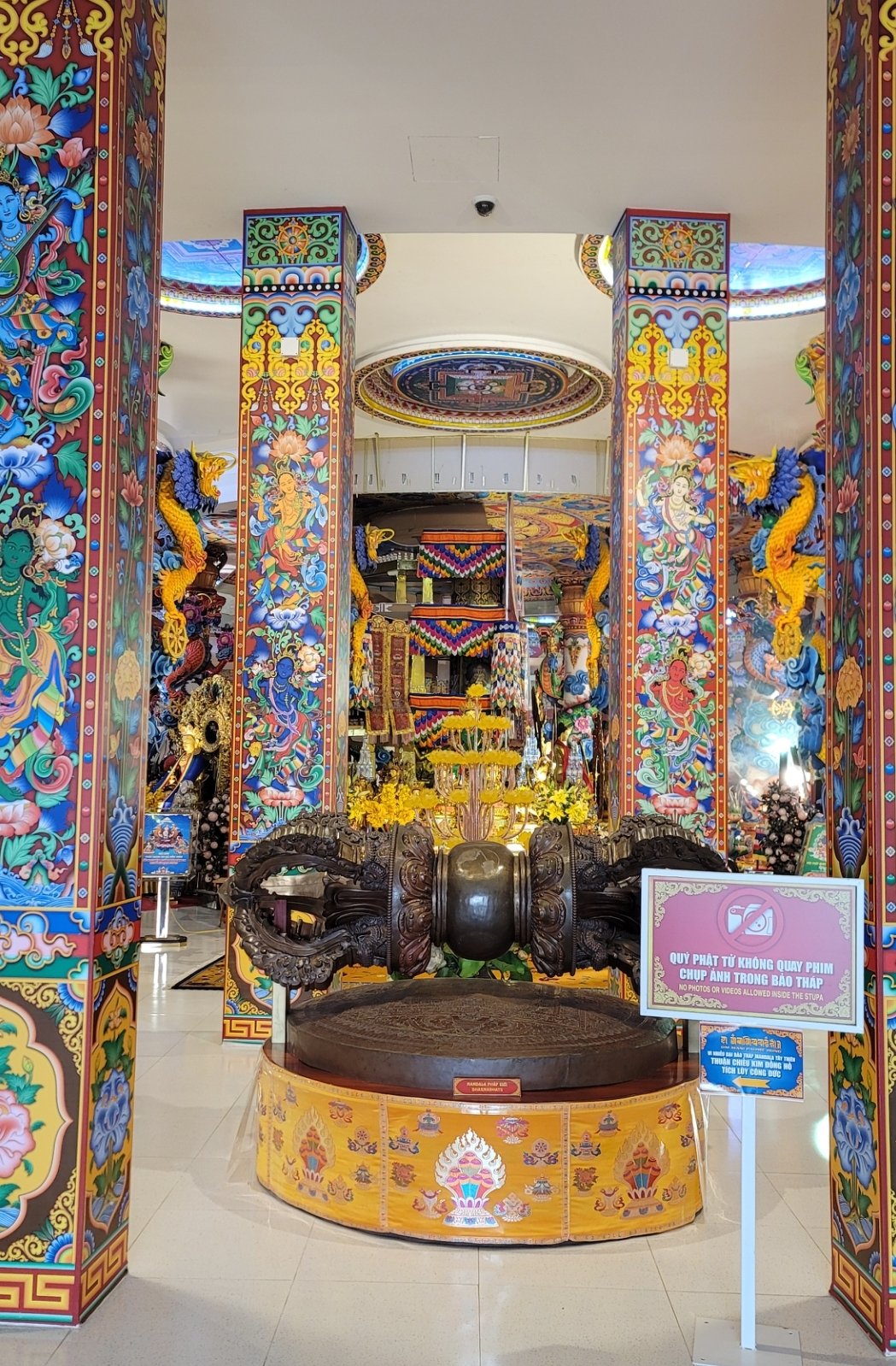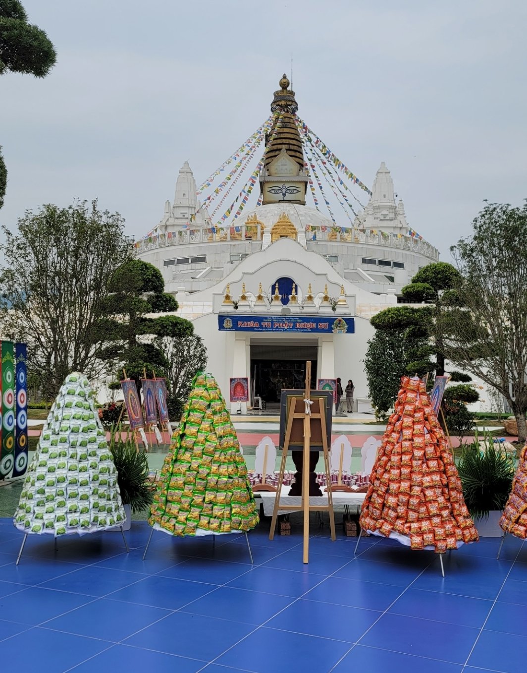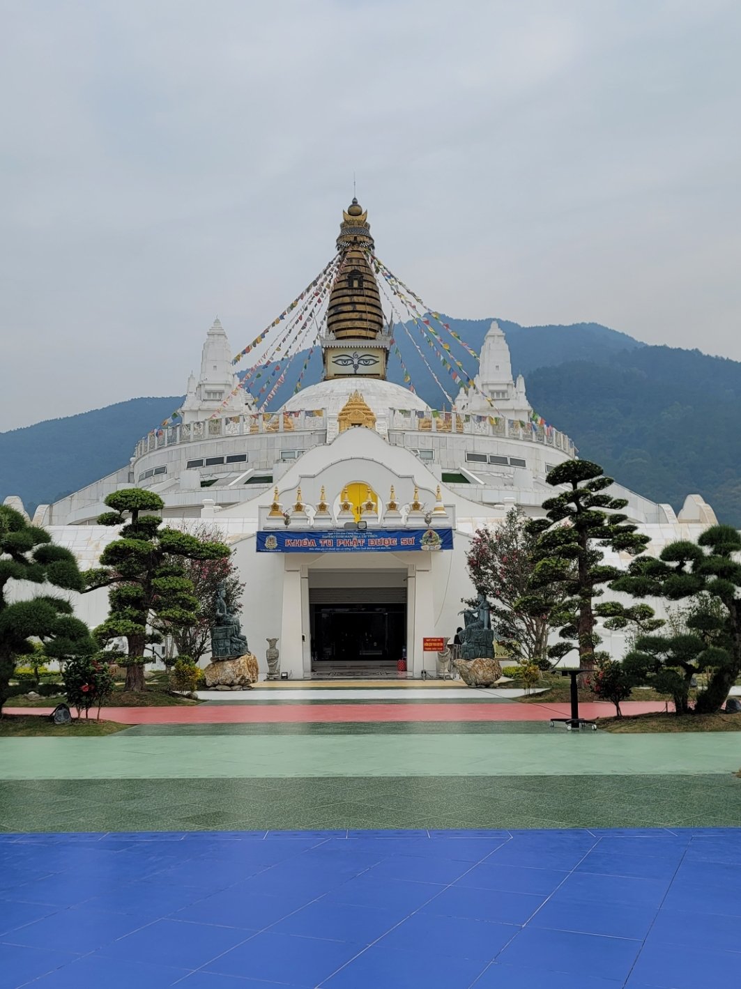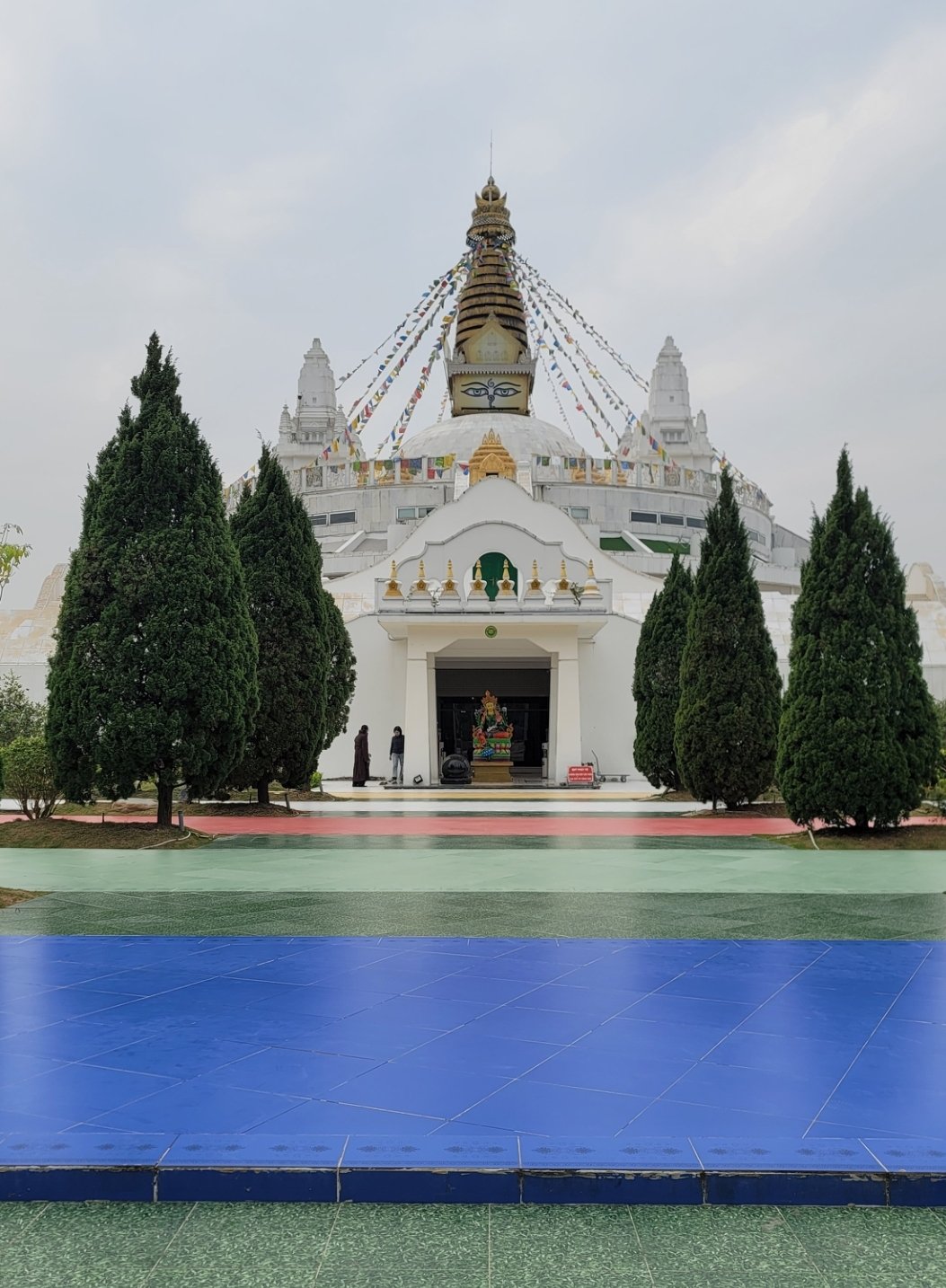 佛塔設立五條同心圓,由內至外以黃、白、紅、綠、藍五種顏色環繞,代表地、水、火、風、空五種圓滿元素。
