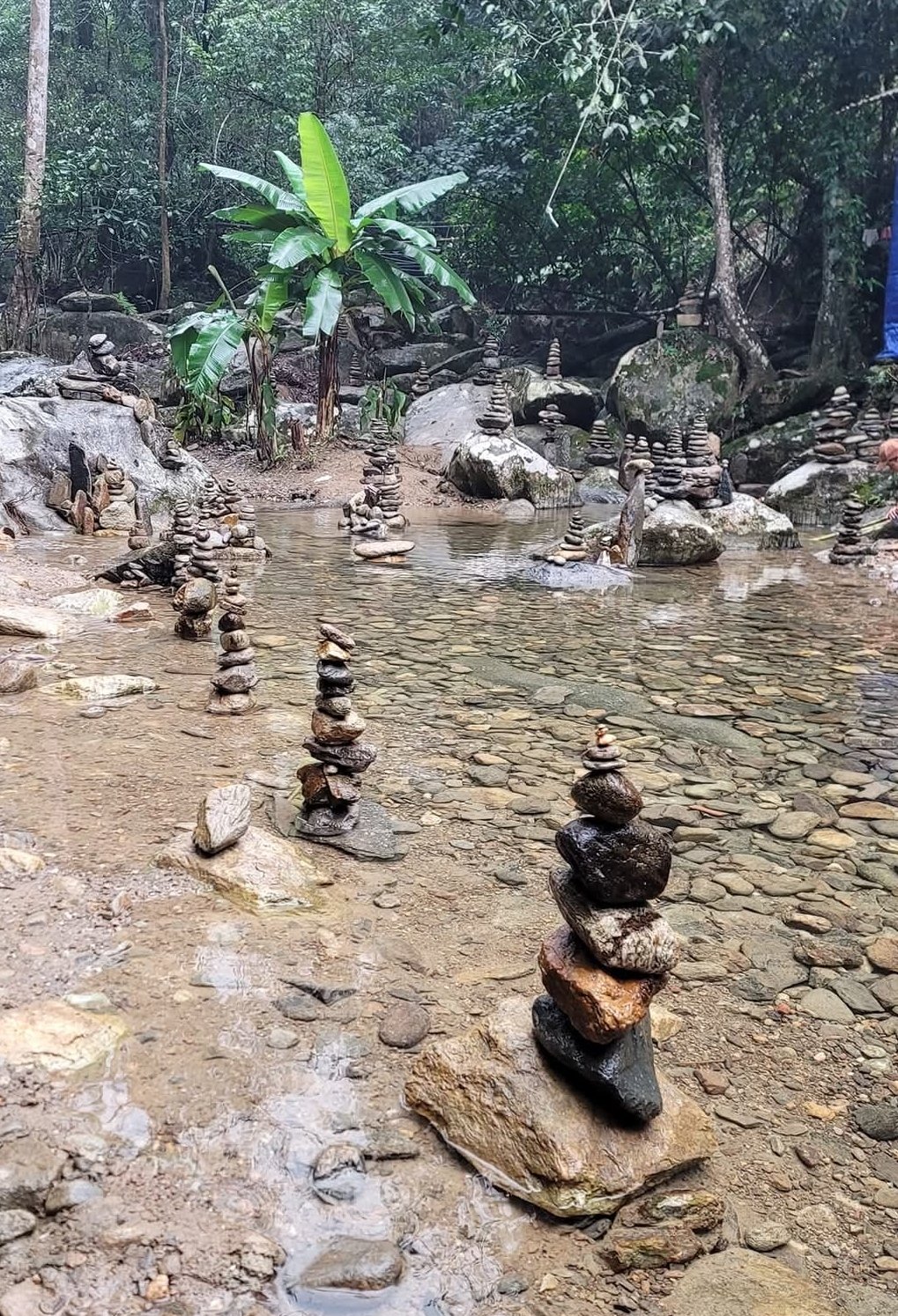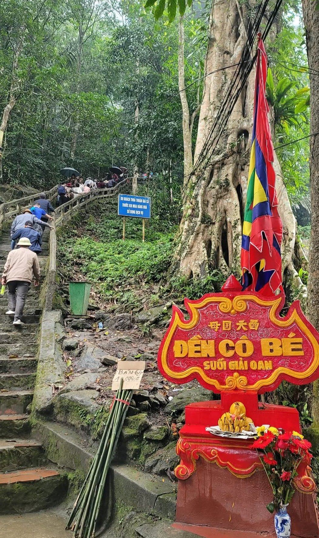 Đền Cậu - đền Cô: 經過通寺往上走,沿著溪岸蜿蜒的石板路約1公里,即可抵達Cậu寺。那裡曾經有一座小廟,如今已被一座看似簡陋的房屋取代,用作禮拜場所。主殿中央的神龕內供奉著三個森林男孩的雕像。 Cậu寺起源於Truong Sinh溪,傳說中「Cậu 」曾在那裡招募和徵召士兵,追隨和支持國母。寺廟於1993年重修。距離鳩寺約2公里,靠近銀瀑,毗鄰嘉溫溪(長生溪上游),讓人得以卸下塵世的塵埃,輕鬆踏入聖地。嘉溫溪歷史悠久,目前供奉嘉貝,相傳她是天上的神童,與國母一同庇佑人民和國家。這裡景色優美,開闊寧靜,植被茂盛,終年氣候清爽。嘉溫溪和寺腳下的古井,更增添了這裡的寧靜祥和。若有人從那裡取水供奉,然後飲用,便會感到異常放鬆、平靜與安寧。