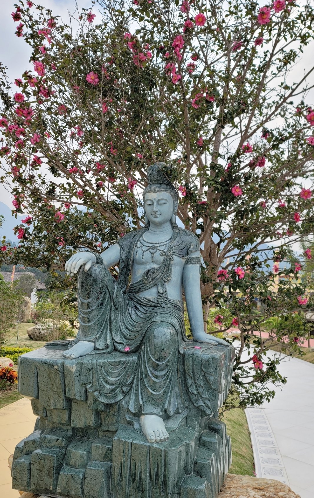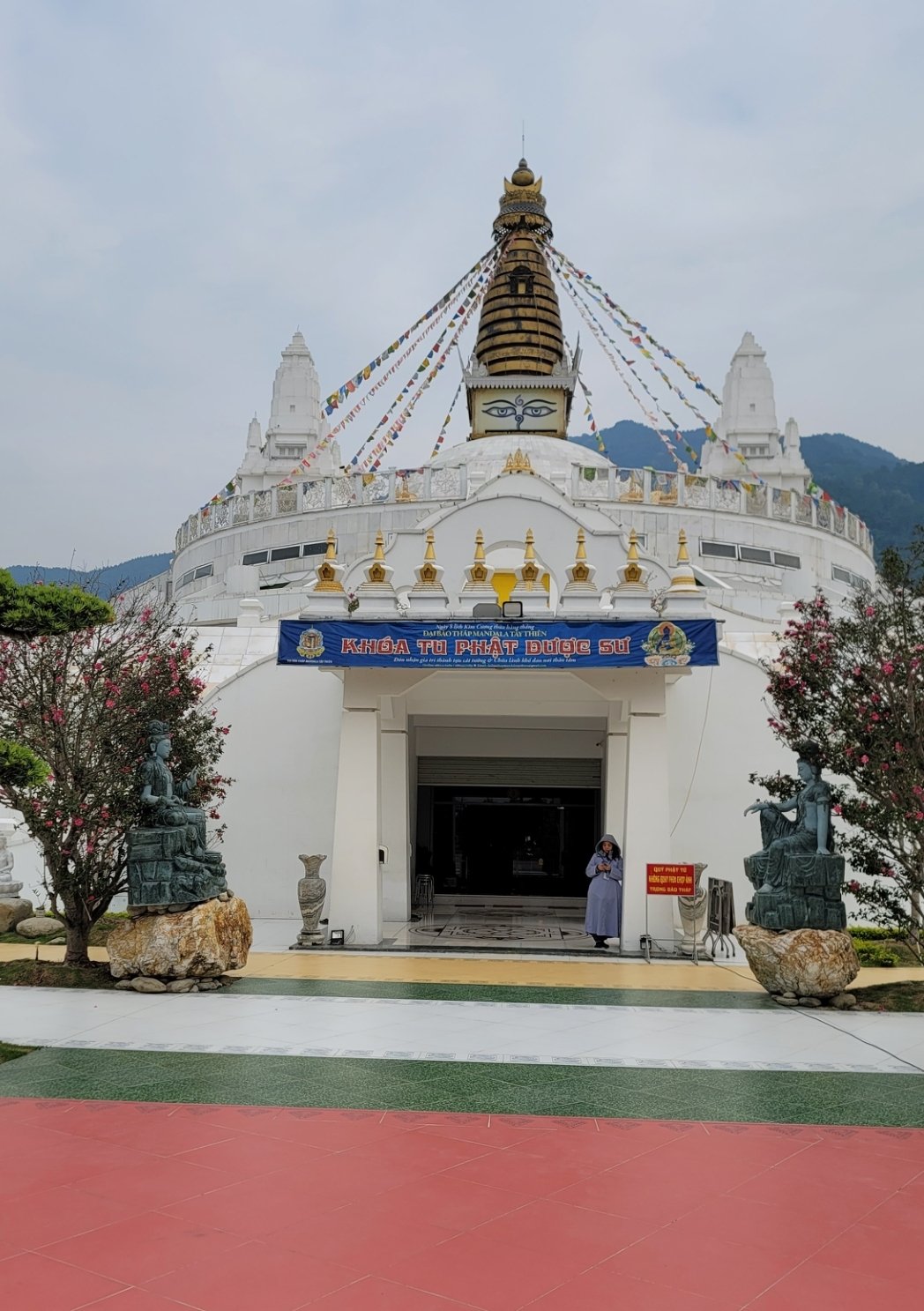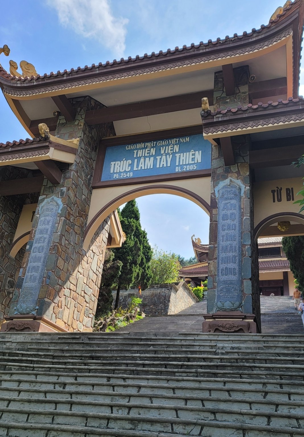 另外,也可以選擇不坐電車,不坐纜車,通寺旁有一登山步道,順著登山步道往上走,約莫一小時可到國母寺。通常我都是爬山,沿途欣賞風景,吸收芬多精,上山後,步行至第一段纜車站,再坐一段電車下山。公車站的下車點離三觀大門及通寺有一段距離,一般遊客大多不會徒步。通常會有摩的Xe Ôm 在此招攬 (Xe 是車的意思,Ôm 是抱的意思,Xe Ôm 俗稱抱抱車),若不想走路可以選擇坐抱抱車,費用大約50K 越南盾左右,可坐到通寺,或坐到電車站。我喜歡走路,對我來說,路程不是問題,倘若沒有大太陽,輕鬆散步,是種享受。走過當地小村落,一邊欣賞風景,一邊觀察當地的風土人情,越式建築等。但若要造訪竹林西天禪寺與竹林安心禪寺,則往另一個方向走,我會選擇搭乘抱抱車,費用約200K越南盾,除了西天禪寺與竹林安心禪寺外,可一併遊覽風景區的幾個寺廟,包含通寺,及山下的西天大佛塔。