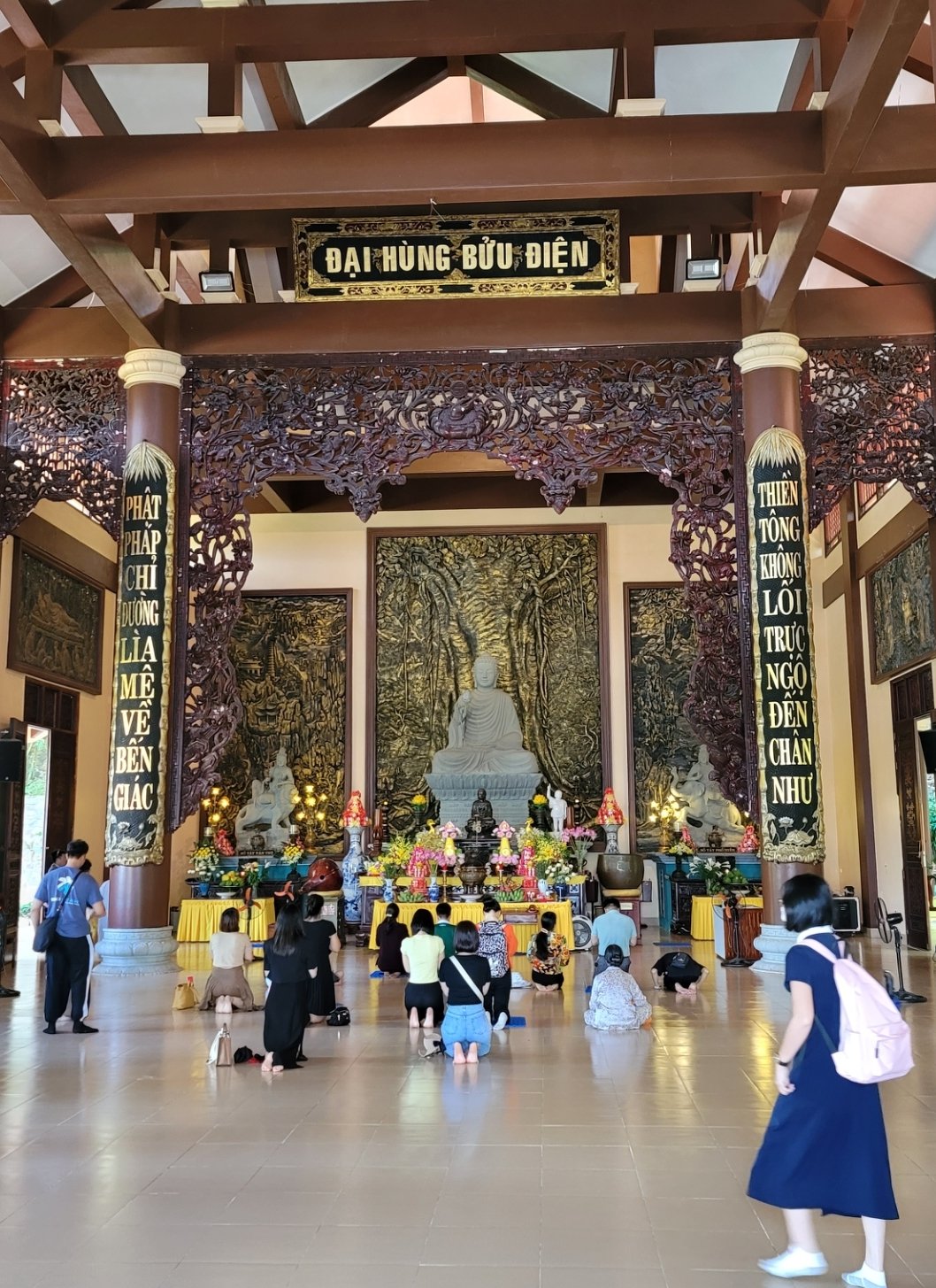 大雄寶殿位於禪寺中央,高17米,面積675平方米,擁有4根柱子,每根柱子直徑近1米,可容納600名佛教徒和遊客在此靜坐或聽聞佛法。大雄寶殿內有一尊佛像,佛像上刻有兩句對句:“種因果得福,福深緣淺;般若圓滿覺悟;佛法示現離惑返本覺之道;禪無直達真理之道。大雄寶殿左側為鐘樓,右側為鼓樓。鼓樓由嘉萊野生菠蘿蜜木製成,直徑達1.5米,長2米;鐘重2噸。