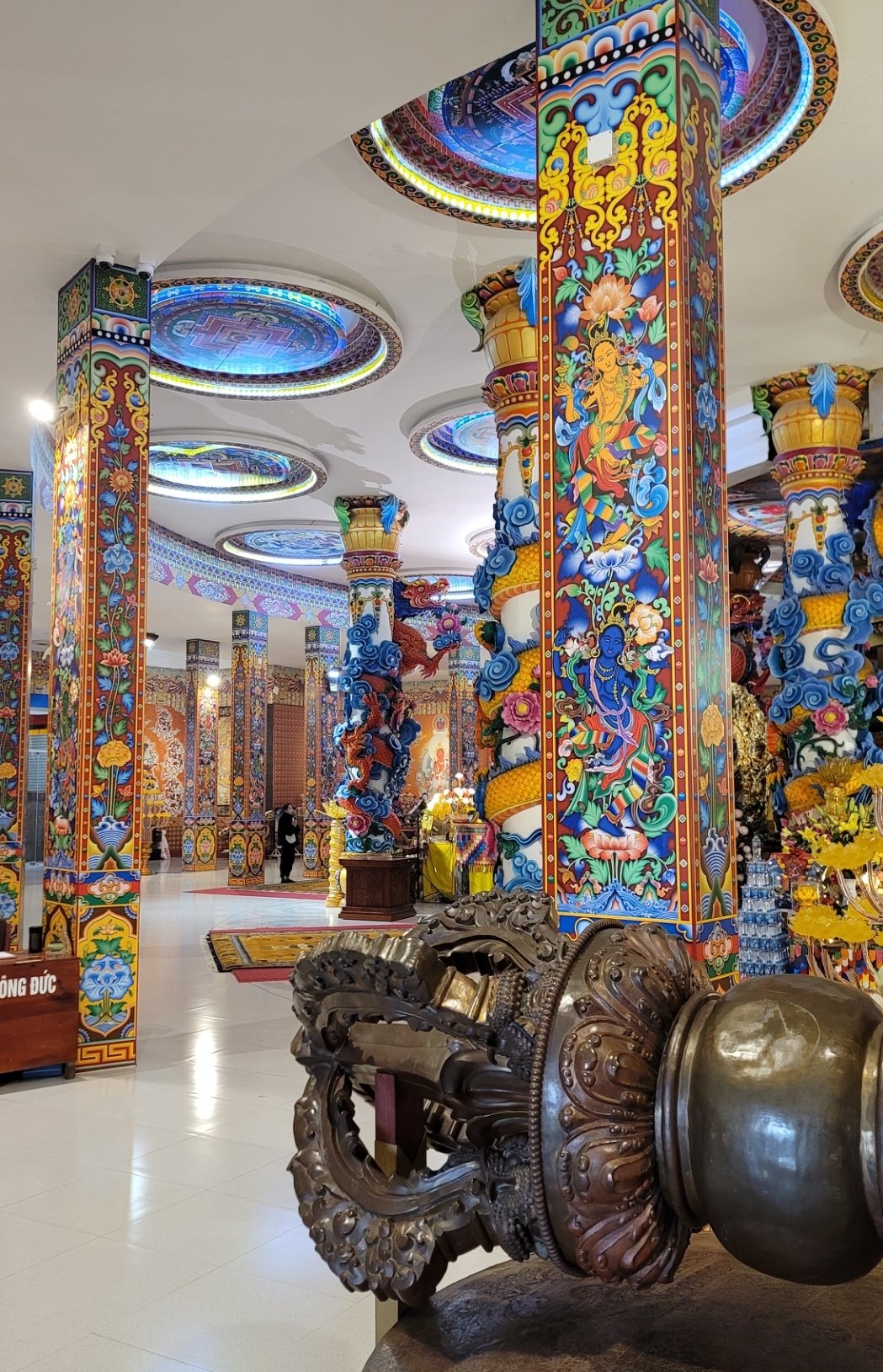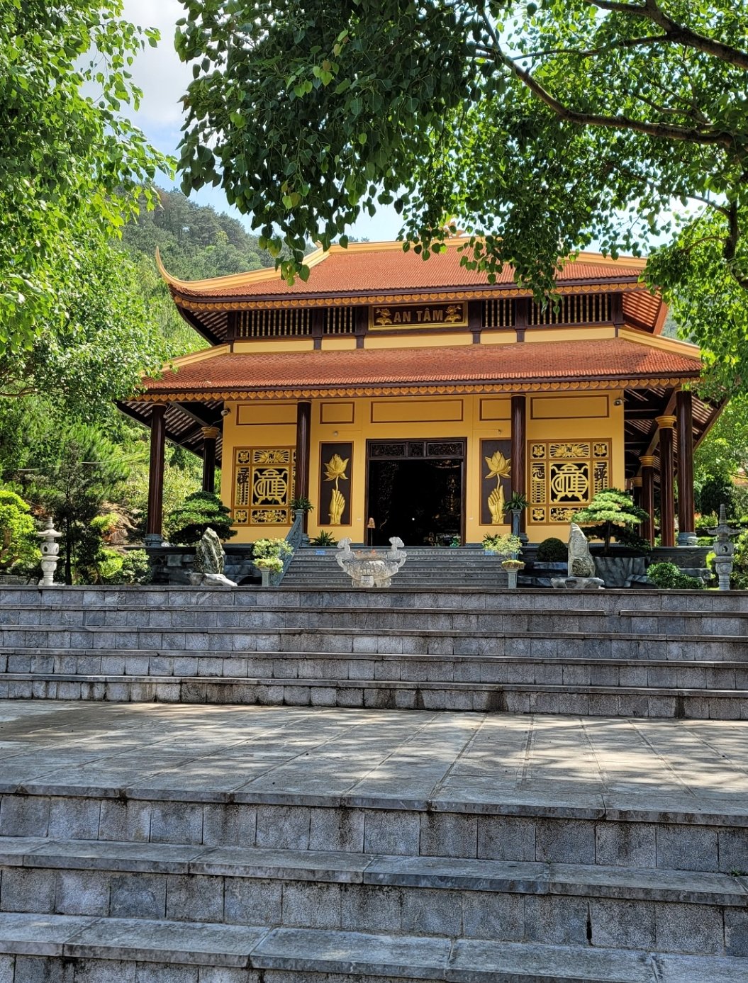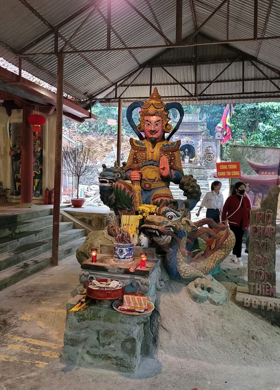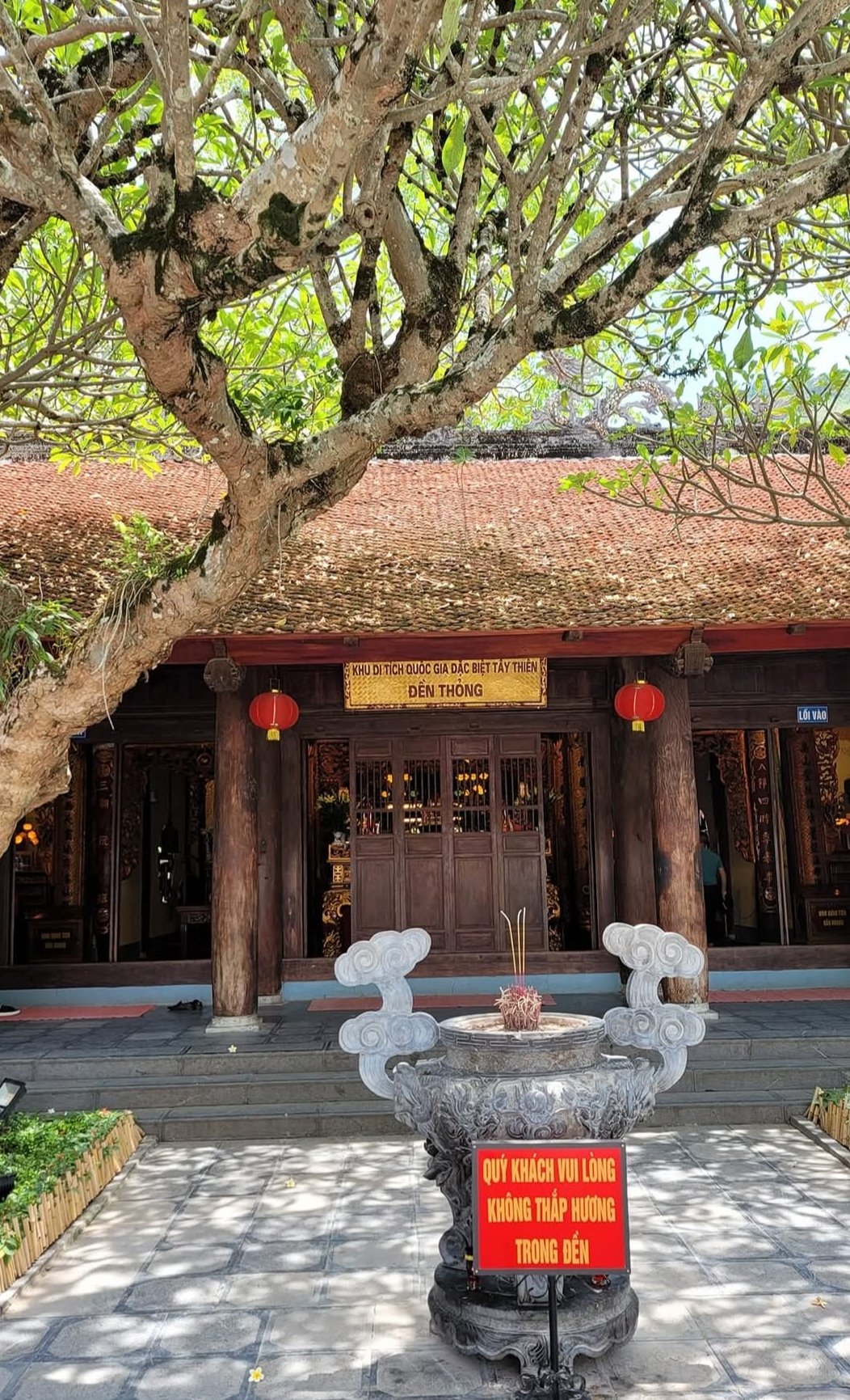 Đền Thượng上寺:這裡山脈起伏,形成了不同的神殿基座。上寺位於寺院中央,背倚石板峰,兩側山臂蜿蜒而下,門面開闊。這裡雲霧繚繞,樹木蔥蘢,百鳥齊鳴,溪水潺潺,是三島山脈的聖地之一。上寺坐西朝南,大門為四柱式,大柱與邊柱之間有一道牆相連,只留中間一門供信眾出入。牆上雕刻著青龍、白虎和象徵四季的植物。中間的石板庭院內有一座神龕,上面雕刻著「福祿壽」三個大字(上下相連),沿著階梯拾級而上。建築為丁字形基座,三廂兩大廂房結構。正面觀之,建築結構平衡,兩層「重疊」的樓面,八個屋頂轉角曲線優美。中室的「對樁」部分懸掛著一塊巨大的橫匾,上面用越南語寫著「西天母神殿」。主殿內,僅供奉一尊西天母神坐像,姿態莊嚴華貴,雙腿筆直,雙臂置於膝上,右手執折扇。