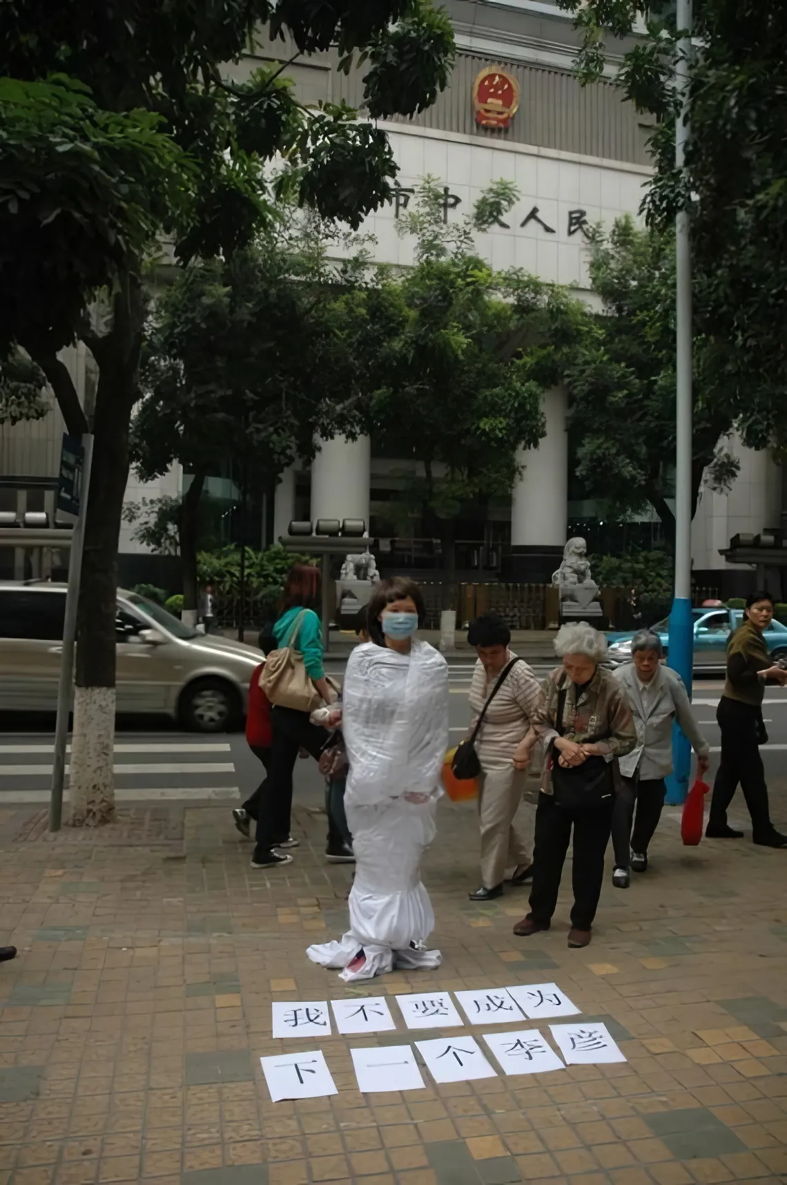 2013年2月3日,在广州、上海、武汉等城市的法院门口,青年女权主义者在广州、上海、武汉、北京、西安共八城的法院门前同步进行公开行为艺术“人蛹”,并配上标语“我不要成为下一个李彦”,以此呼呼公众关注。(图片来源:网络)