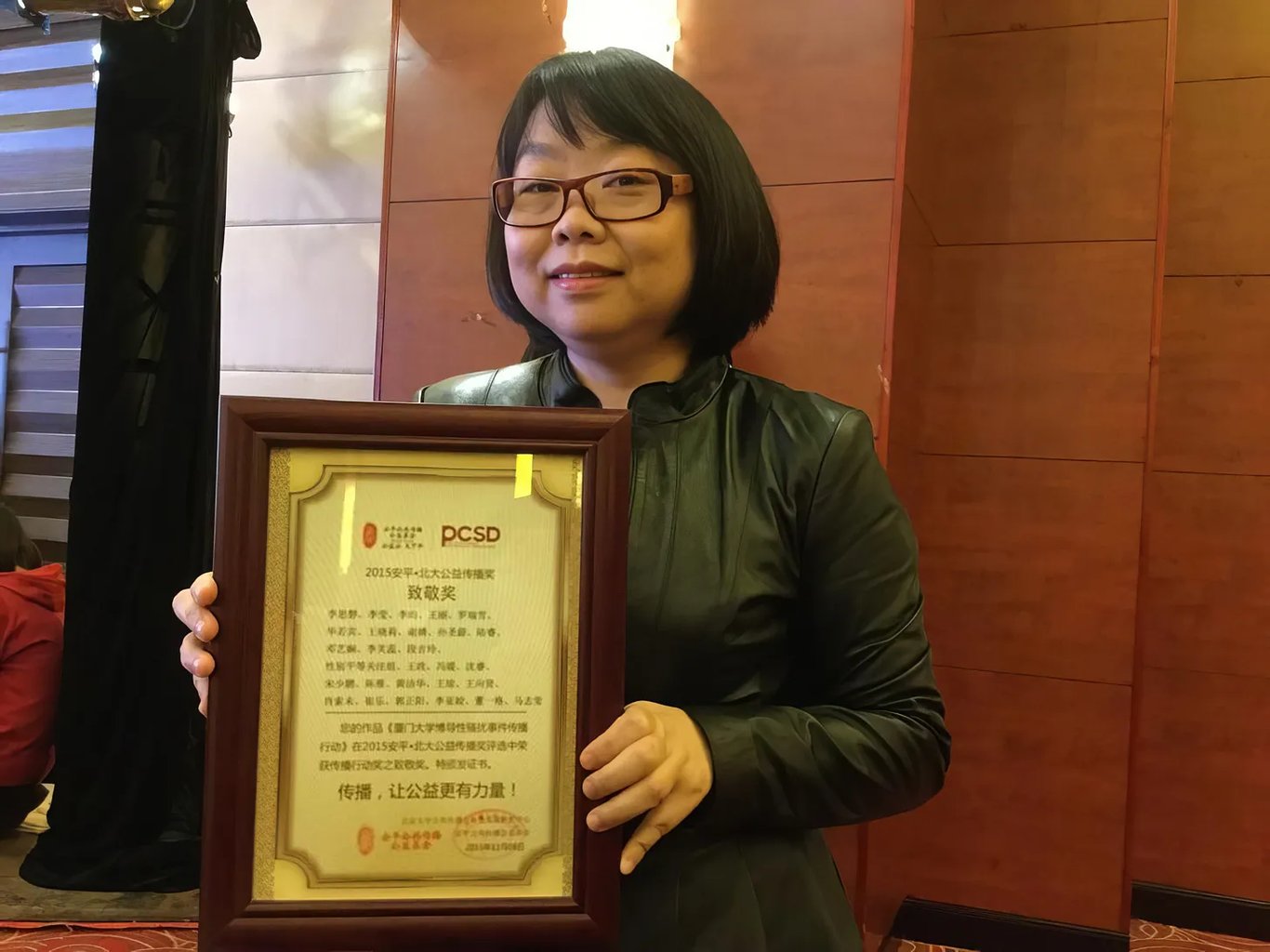 2015年,新媒体女性以“厦大博导性骚扰事件”的系列评论和报道获安平·北大公益传播致敬奖。经李思磐与主办方沟通,奖牌尽可能加上了所有该次传播行动参与者的名字,她们分别是律师、志愿者、女权活动家、高校学者等。(图片来源:网络)