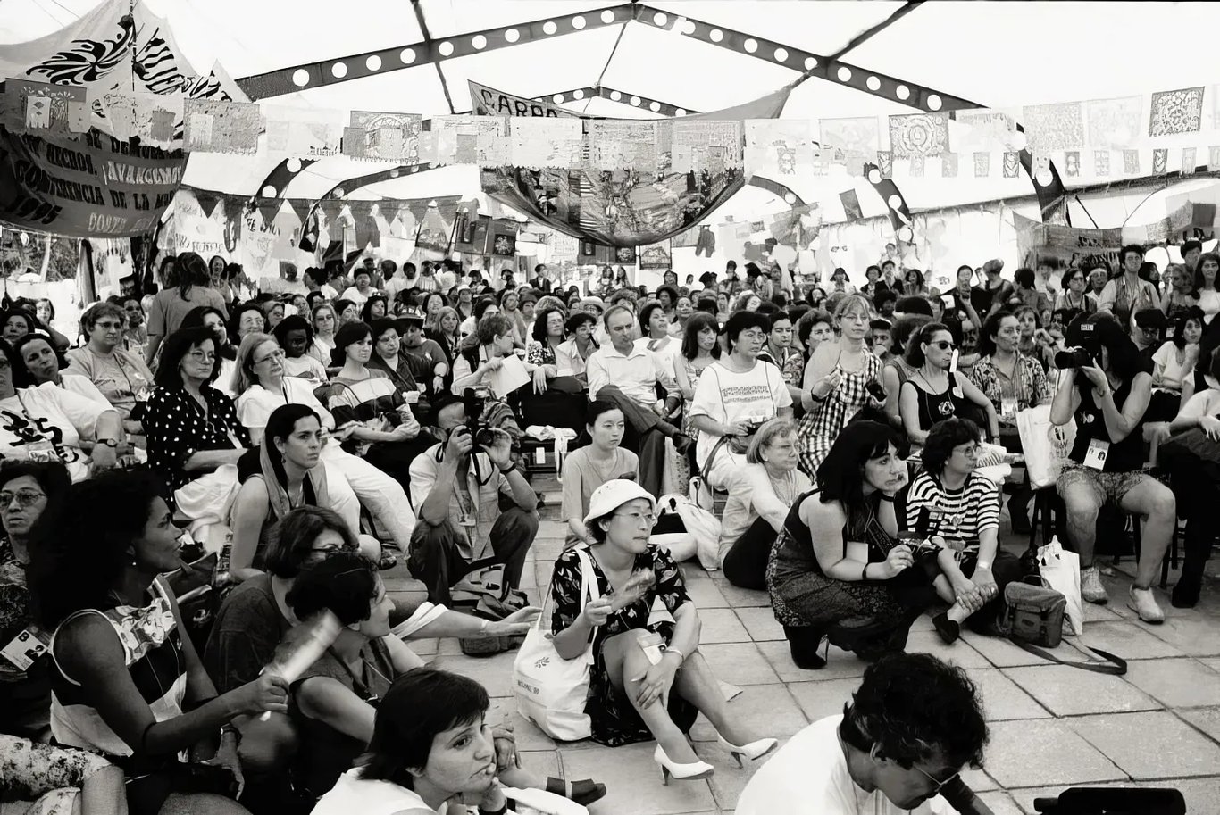 1995年8月30日至9月8日,非政府组织妇女论坛在北京怀柔举行。由于场地不足,怀柔第一中学设置出帐篷作为部分论坛的讨论场所。图为来自拉丁美洲、加勒比地区以及其他各地区与会者在“帐篷论坛”中参与活动。(图片来源:澎湃新闻)