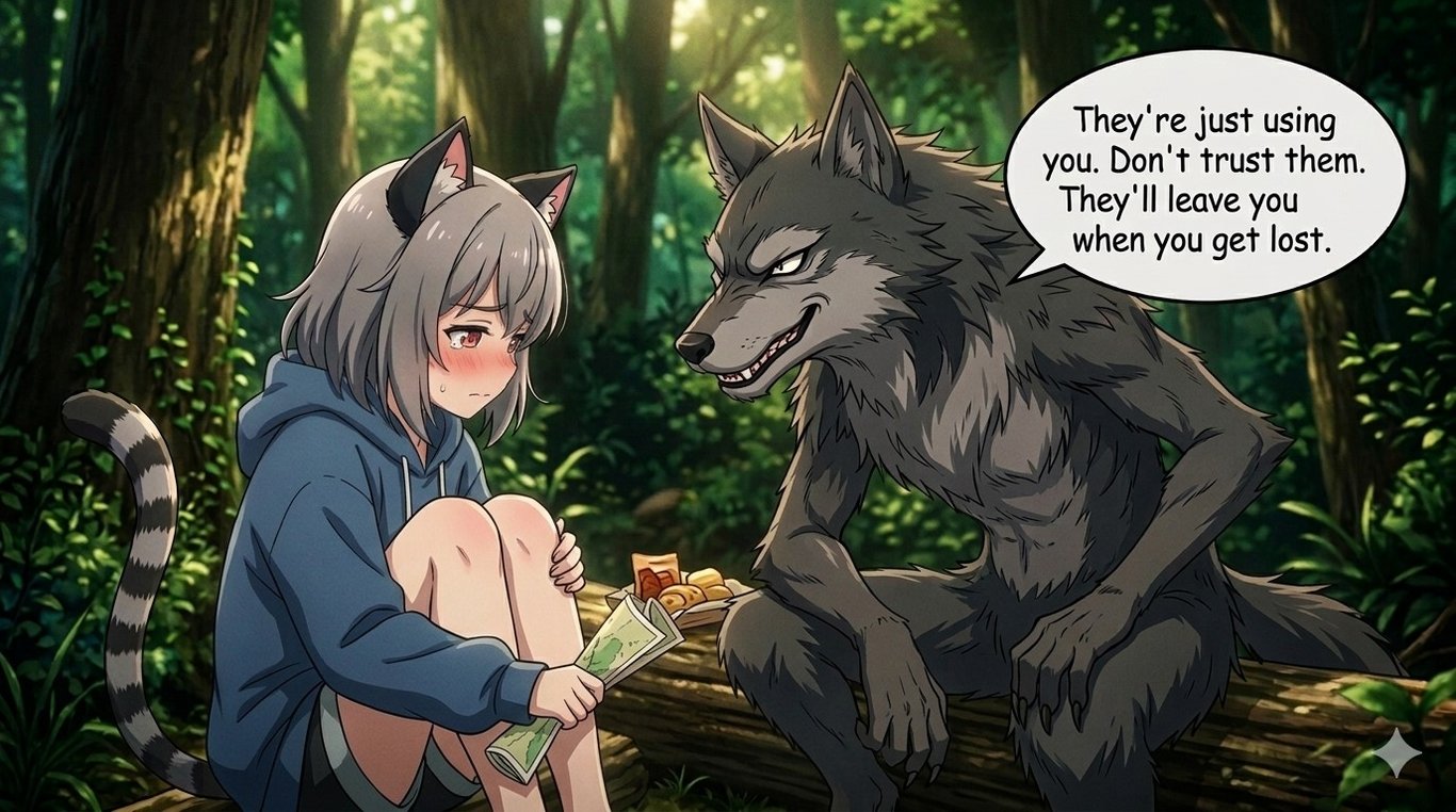 狼聽到了阿貓交到朋友的事情,狼不懷好意地對阿貓說:唷,蠢貓,妳以為外面那些見過世面的人,是真心想跟妳交朋友的嗎?別傻了,他們只是覺得妳好玩想逗弄妳一場罷了!
