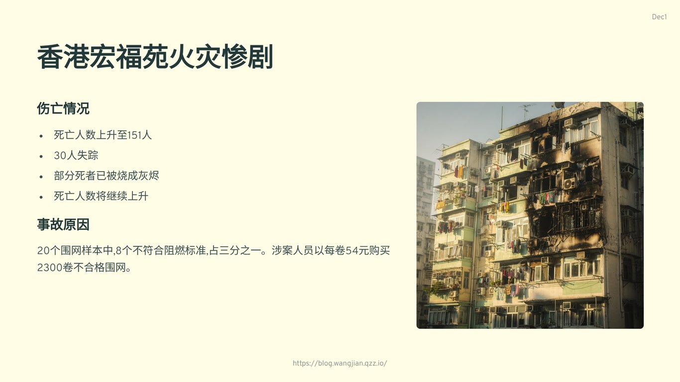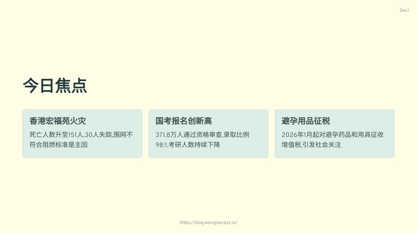 2025年12月1日新闻简报:香港宏福苑火灾真相、日本政局与旅游业、中国考公热与避孕税、全球军火与数据安全大事件