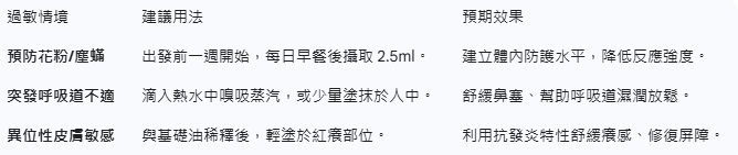 過敏是免疫系統「過度反應」的結果。黑種草油具備獨特的雙向調節功效:它能強化抗病能力,同時抑制過度的免疫攻擊。對於需要長時間待在異地的旅人來說,這種「穩定力」正是預防突發過敏的關鍵。