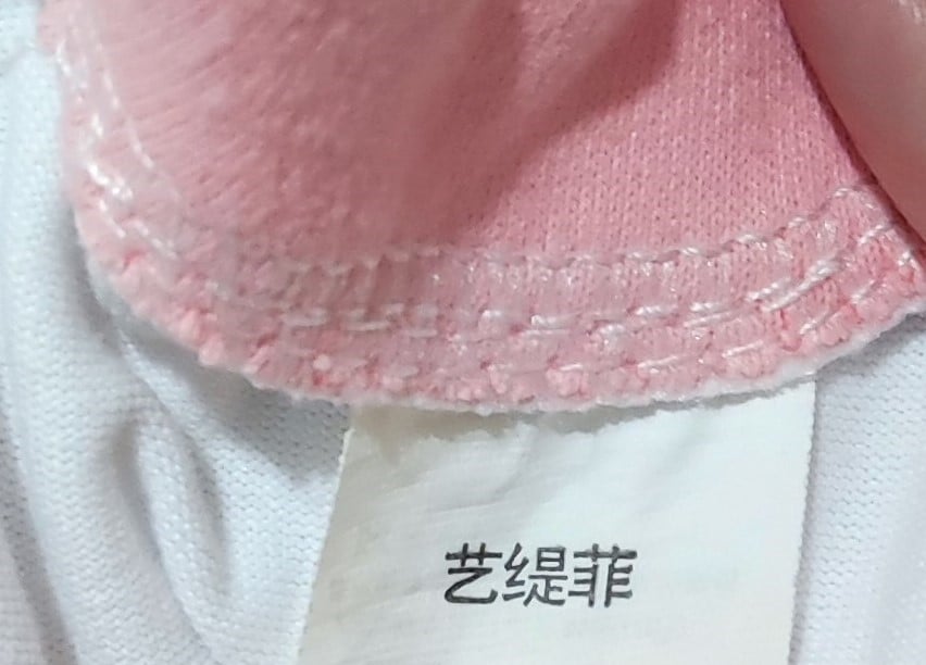 一邊拿指甲銼刀(紙的那種)磨一邊看影片的我...,沒有認真看自己磨的地方...,等我把標籤取下......,領口與上衣連接地方的線也被我磨掉了....。