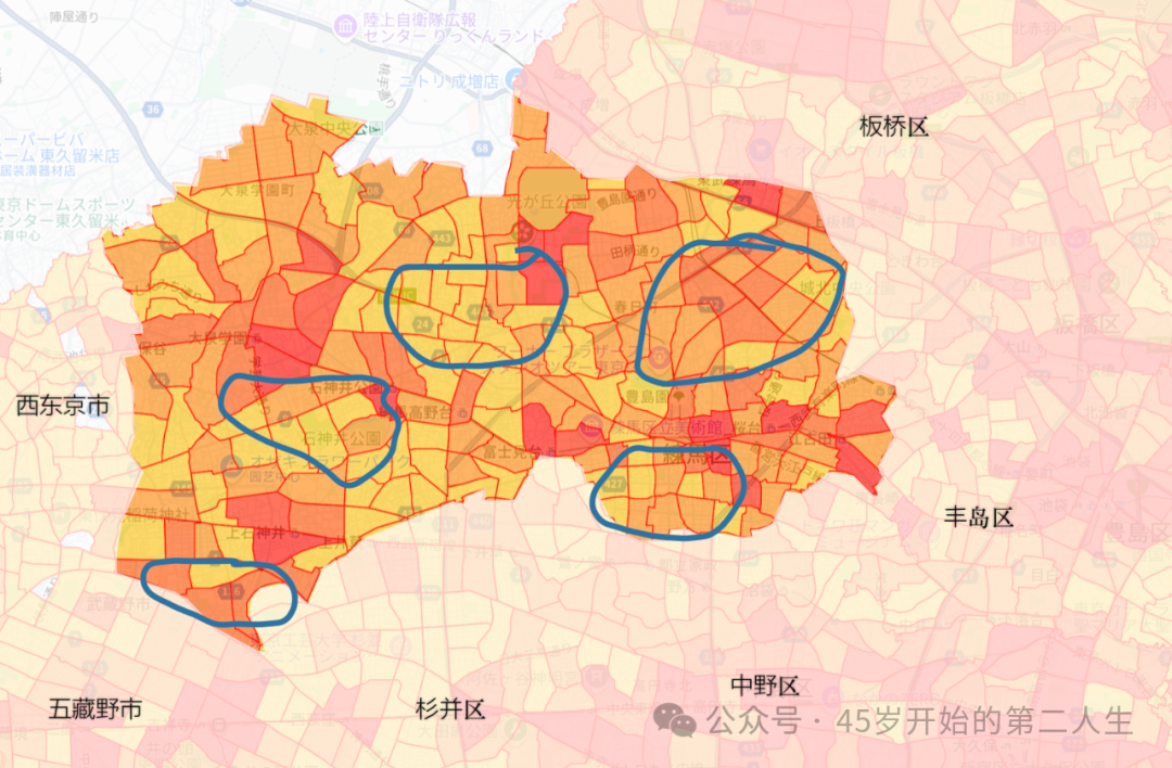 虽然这些地段自然空间多,生活环境宜居性较高,加上靠近站点交通便利,治安状况也相对不错,但练马区其他区域的也很好,所以练马区属于整体状况良好,与收入关系不大的地区。