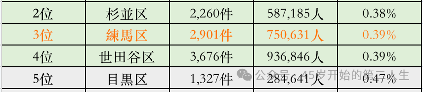 如果只从这个表格来看,练马区是排名前三的治安良好的区,不过我建议再结合昼夜人口比例来看这个数据,会更有参考价值。