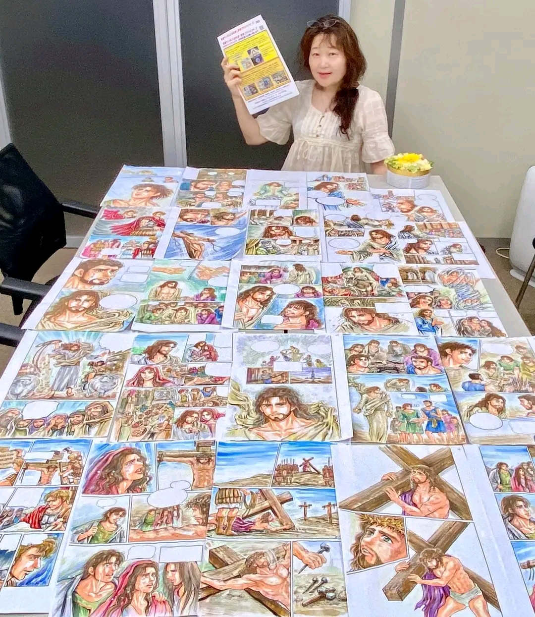 為了確保作品中場景與服飾的真實性,她曾親自前往以色列進行實地考察,將第一手的觀察化為創作的養分。此外,她的創作並非孤軍奮戰。由於她本人不擅長電腦操作,作品的掃描與數位化工作便由她的丈夫擔綱。這種「夫婦二人三脚」的合作模式,體現了家庭的支持與團隊的力量,共同完成這份神聖的使命。