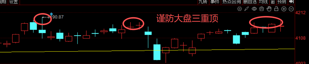 为什么A股大盘在顶部出现天量?因为有人在大量卖出,当然也有人承接,但放出天量要能中阳线向上突破才是向好的信号,如果天量滞涨,代表顶部有人大量出货,而做多资金只能勉强支撑不跌或者跌的不多,从而出现天量十字星或者天量小阴小阳。这样很容易形成阶段顶部,何况又结合前两个4190和4170顶部附近,更容易形成三重顶结构,形成中期顶部。
