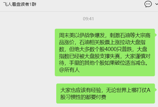 周末美以伊战争爆发,刺激石油等大宗商品涨价,石油相关股票上涨拉动大盘指数,但绝大多数个股4000只普跌,大盘指数已经被大盘股支撑失真,大家谨慎对待,手里的其他个股如果破位适当减仓。 @所有人
