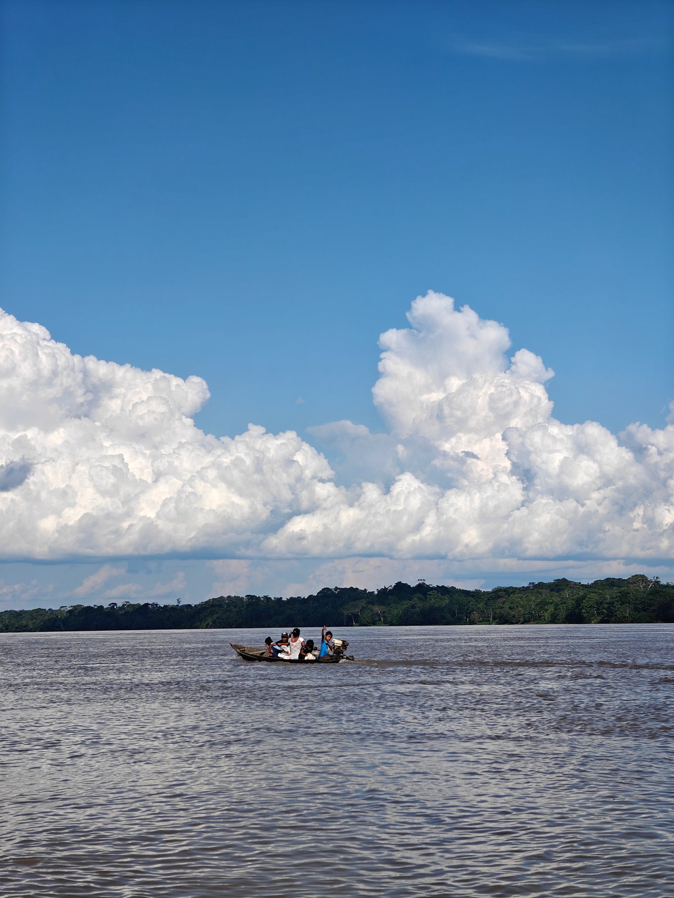 前方有两个人在奋力划着独木舟,没有加装马达,全靠体力驱动。凭体能对抗亚马逊河,的确是很艰难。