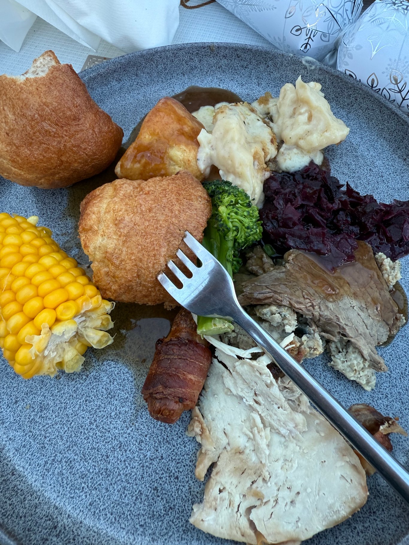 拿起肉汁淋在上面,用約克郡布丁沾滿汁液,火雞還有烤牛肉,花椰菜還有玉米,再插起一根培根小香腸,沾醃製紫甘藍,還有香草餡料,烤馬鈴薯還有焗烤白花椰菜。